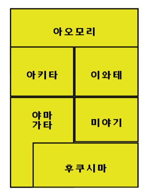 원전사고가 터진 후쿠시마, 사고를 피해 야마가타로 피하려 했지만 미아(미야기)가 발생했다. 그래도 위쪽 지역은 피해가 덜해 아기를 키우기 좋타(아키타). 그러면 이리 데리고 와(이와테)! 그 위는 너무 추워서 눈이 많이 내려 덮인 숲이라 해서 파란 숲(아오모리).