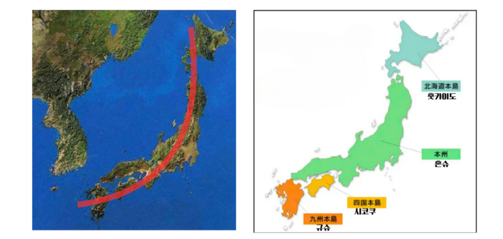 일본은 4개의 큰 섬과 여러 개의 작은 섬들이 줄지어 펼쳐진 '열도(列島)'입니다. '활모양으로 줄지어 있다'라고 해서 '호상열도(弧狀列島, island arc)'라고도 합니다. 4개의 큰 섬은 북쪽에서부터 '홋카이도(북해도, 北海道)', '혼슈(본주(토), 本州)', '시코쿠(사국, 四國)', '규슈(구주, 九州)'로 구분합니다.