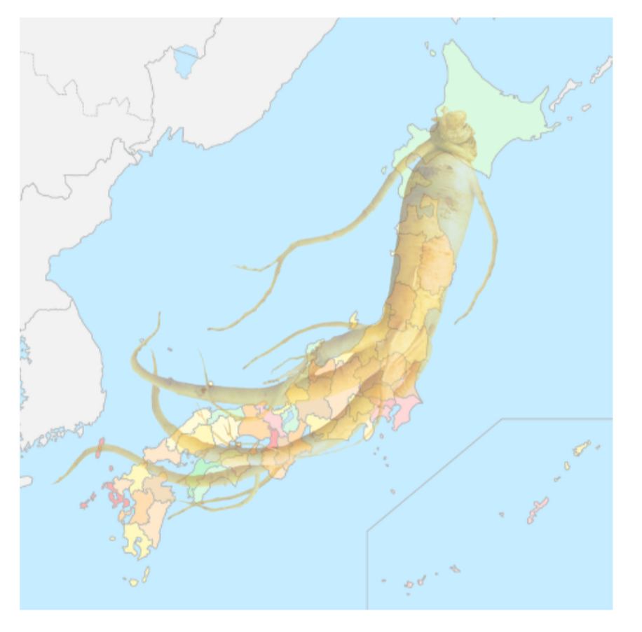 일본지도는 해마나 용 등으로 형상화합니다. 하지만 저는 일본 지도를 보면 늘 축 늘어뜨려놓은 인삼이 연상되었습니다. 그래서 누워있는 인삼과 같이 지도를 기울여 보겠습니다.