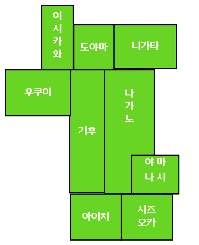 훅 이식해서 가져와 보니 또 야마(산)가 있네. 산은 니가타. 여기는 눈이 많이 내려서 기후가 종종 나가서 아이치! 기침이 나오는 곳. 야마나시의 후지산이 조용히(시즈) 언덕(오카)을 만드는 곳.
