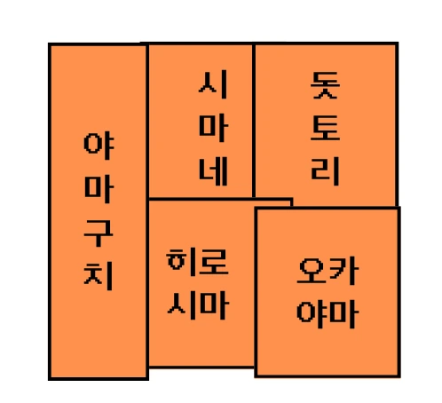 본토로 들어가는 입구(구치)라서 야마구치, 독도를 자기네 땅이라 우기는 정도가 심한 시마네, 크기가 도토리 만한 돗토리, 원폭을 맞았던 히로시마, 언덕과 산이 함께 있어 주코쿠의 경계가 되는 오카야마