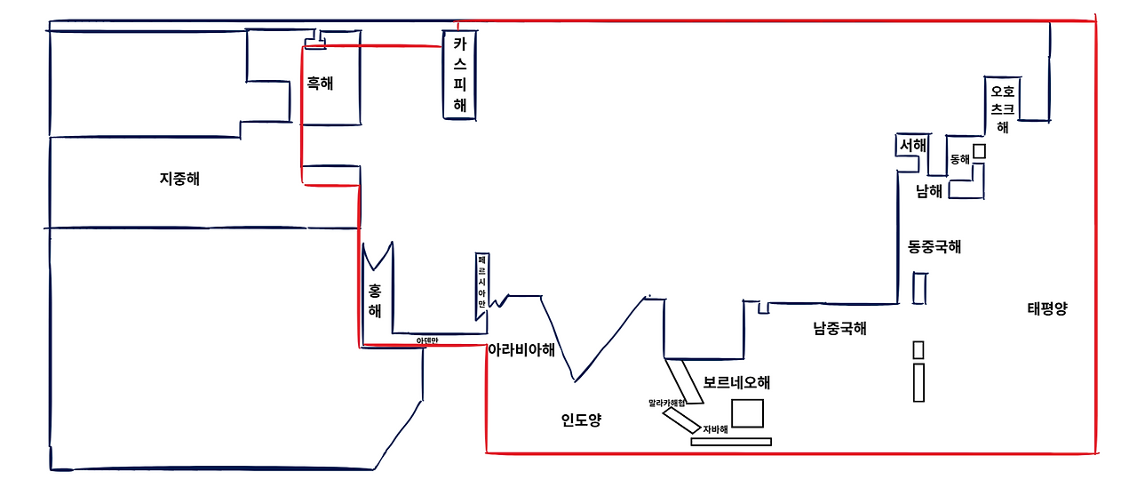 우랄산맥과 보스포루스해협, 수에즈운하로 이어지는 서쪽 경계를 따라가면 남쪽의 인도양, 동쪽의 태평양, 북쪽의 북극해를 만나겠네요. 자랑스러운 대한민국을 둘러싼 3면의 바다와 캄차카반도 서안의 오호츠크해, 중국 동쪽의 동중국해와 남쪽의 남중국해, 동남아시아 주변의 말라카 해협, 그리고 아라비아 반도 아래의 아라비아해와 페르시아만, 아프리카 뿔과 아라비아 반도 사이의 아덴만으로 구성됩니다.