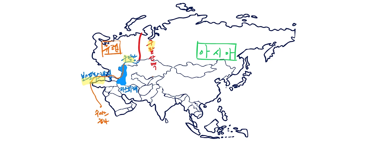 아시아와 유럽의 경계는 높지는 않지만 긴(2500km) 우랄산맥입니다. 우랄산맥 아래로 우랄강이 흐르고, 우랄강은 카스피해와 흑해를 지나 보스포루스해협까지가 경계의 연장선이 됩니다. 캅카스 산맥을 경계로 넣기도 합니다.