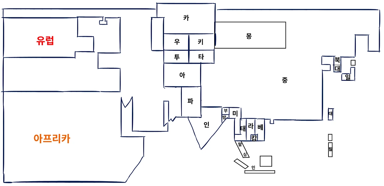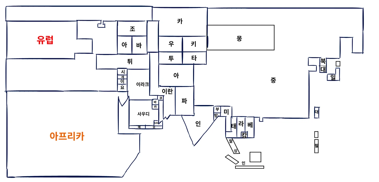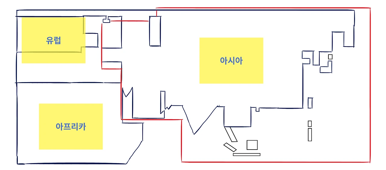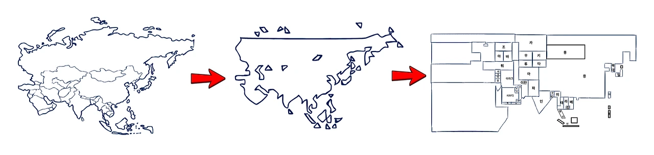 아시아라는 거대하고 복잡한 지도를 직선으로 단순화한 후 토막을 쳐서 모듈화 시켜 보겠습니다.
