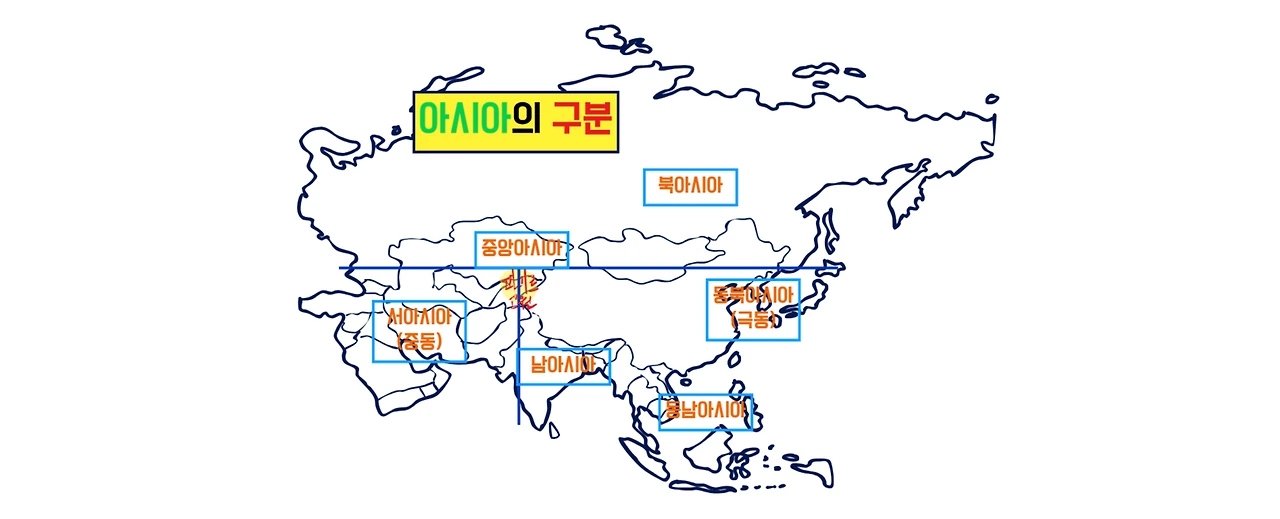 대한민국과 일본, 중국이 위치한 동북아시아와 인도차이나 반도부터는 동남아시아로 부릅니다. 그리고 중앙아시아의 위는 북아시아로 칭합니다.