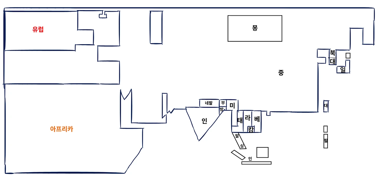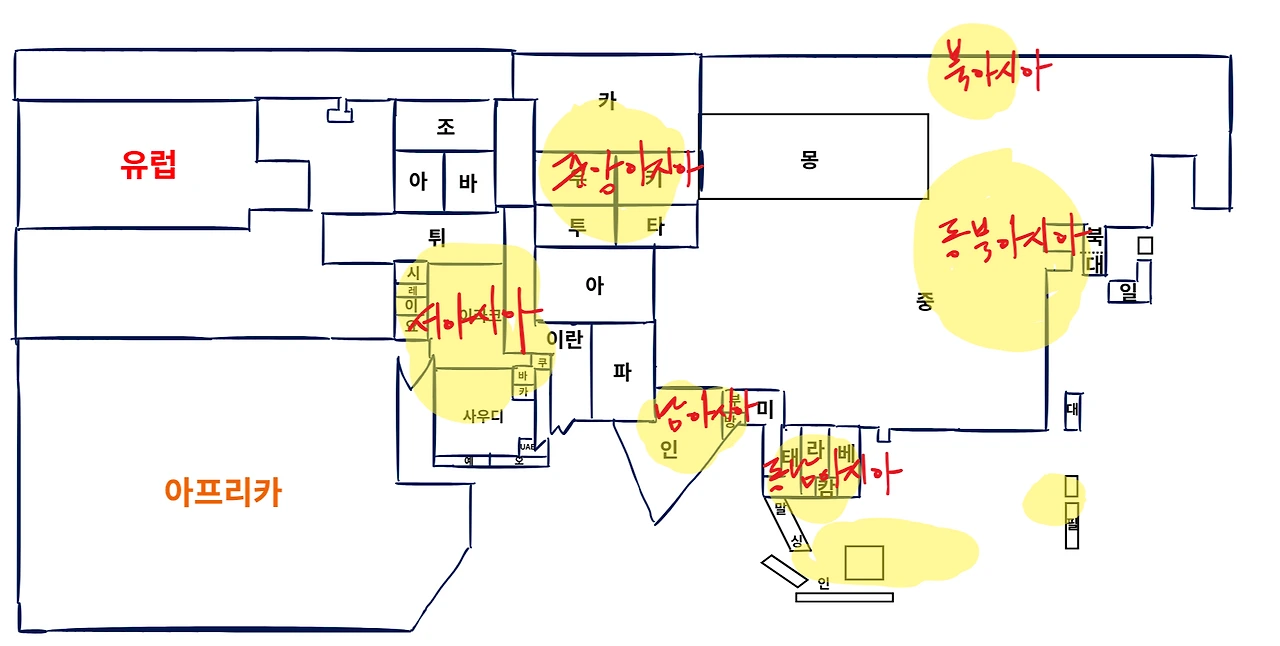 그럼 아시아의 복잡한 지도를 단순하게 그려보도록 하겠습니다.