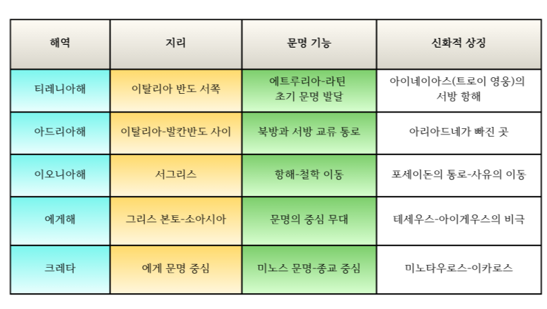 아드리아해는 모험의 경계, 이오니아 해는 지혜의 통로, 에게해는 영웅의 무대, 크레타는 신들의 기원 정도로 정리할 수 있지 않을까요?