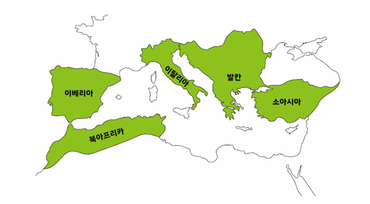 지중해를 누르는 네 개의 기둥(반도). 즉 '이베리아'와 '이탈리아', '발칸'은 유럽입니다. 튀르키예가 위치한 '아나톨리아'는 예로부터 소아시아라 칭하며 구분 지어왔습니다. 그리고 지브롤터 건너 북아프리카 반도도 지중해와 접해 있습니다. 포에니 전쟁(로마 VS카르타고)과 트로이 전쟁(그리스 VS소아시아), 펠로폰네소스전쟁(스파르타 VS아테네) 등 역사에 한 획을 그은 굵직한 전쟁들 모두 지중해를 배경으로 일어났습니다.