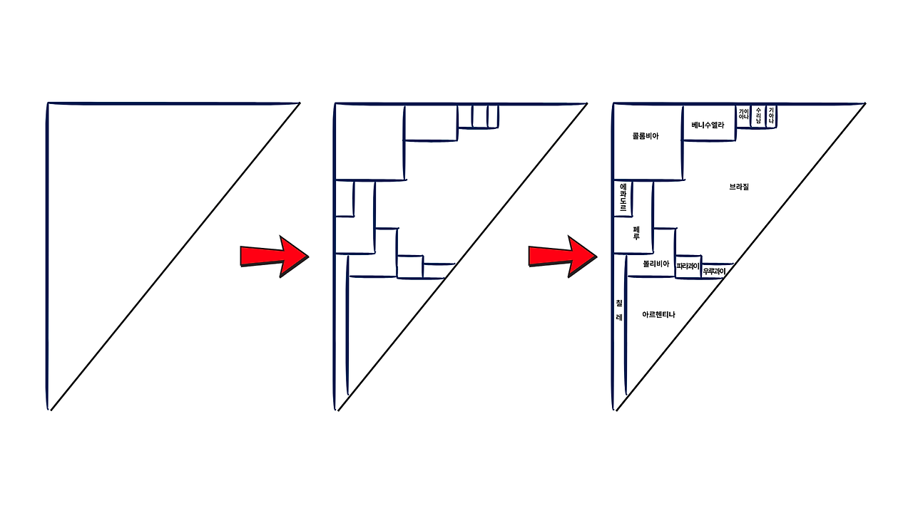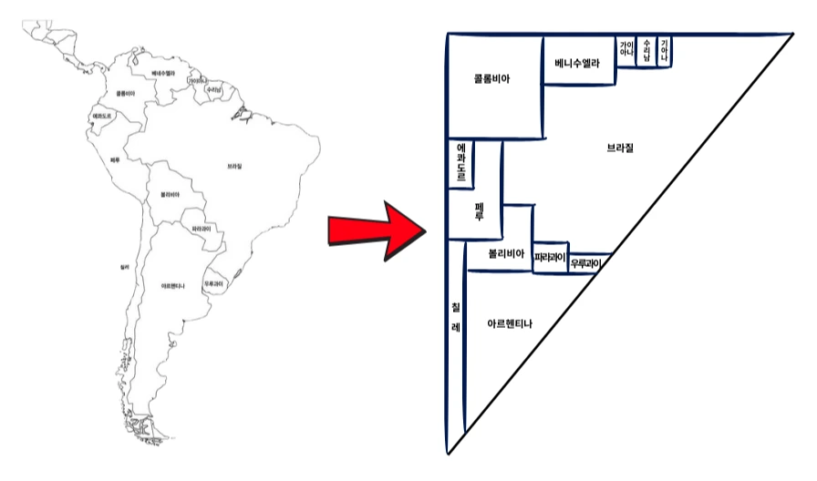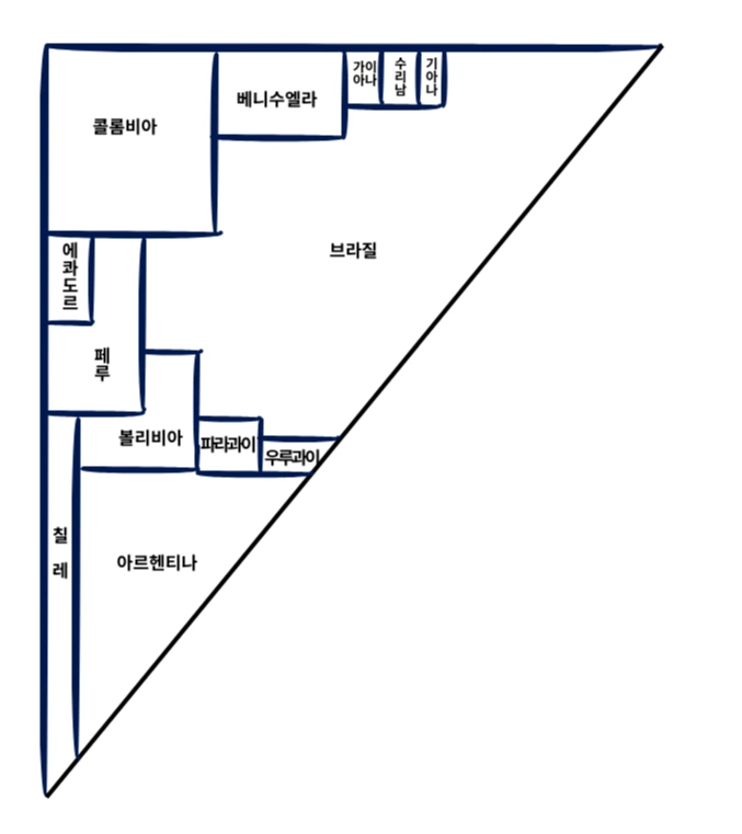 브라질을 가장 크게 구획하고, 세계에서 8번째로 큰 아르헨티나(약280만km2)도 역삼각형으로 남쪽에 그려줍니다. 이후 페루와 콜롬비아, 볼리비아, 베네수엘라를 비슷한 크기로, 세로로 긴 나라 칠레는 안데스 산맥이 분포하는 남미의 서안 쪽으로 길게 그려줍니다.