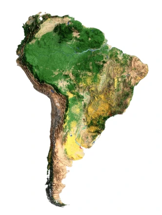 남아메리카는 북쪽이 넓고 남쪽으로 좁아지는 역삼각형 형태입니다. 북쪽의 넓은 아마존 분지에서 점점 수렴하여 파타고니아-티에라델푸에고로 끝이 나죠. 적도에 가까운 북쪽은 열대, 남쪽의 한대기후까지 기후의 연속성이 그대로 드러나는 세로로 긴 형태입니다.