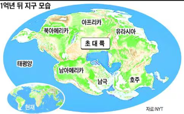 초대륙 판게아는 '뜨거운 속열에 의해 부풀어 오른 빵 반죽'처럼 늘어나 금이 가고, 그 틈으로 불(마그마)이 솟아오르며 바다는 갈라진 것입니다. 그럼 미래의 지구는 또 어떻게 대륙과 바다가 배치될까요?