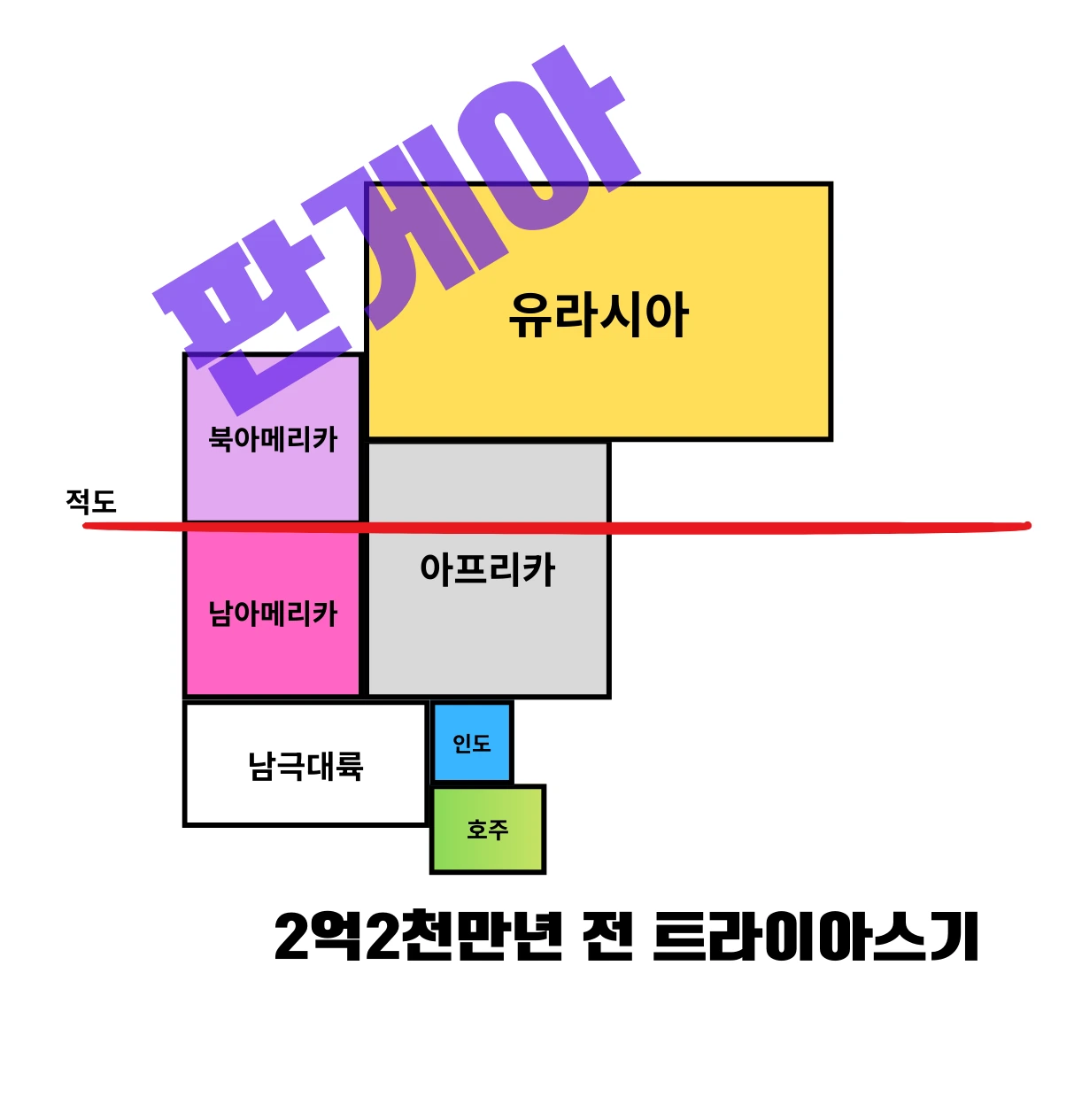 판게아는 두 개의 거대한 대륙을 만듭니다. 북쪽의 로라시아(Laureasia) → 북아메리카 + 유라시아(유럽·아시아 일부)와 남쪽의 곤드와나(Gondwana)→ 남아메리카 + 아프리카 + 인도 + 남극 + 오스트레일리아입니다. 이때 사이에 테티스해(Tethys Sea) 같은 바다가 넓어지기 시작합니다. 이때 북쪽의 로라시아가 분리가 시작되며 유라시아는 북아메리카와 점점 멀어지기 시작합니다. 이 과정이 훗날 북대서양 형성으로 이어지게 되는 것이죠.