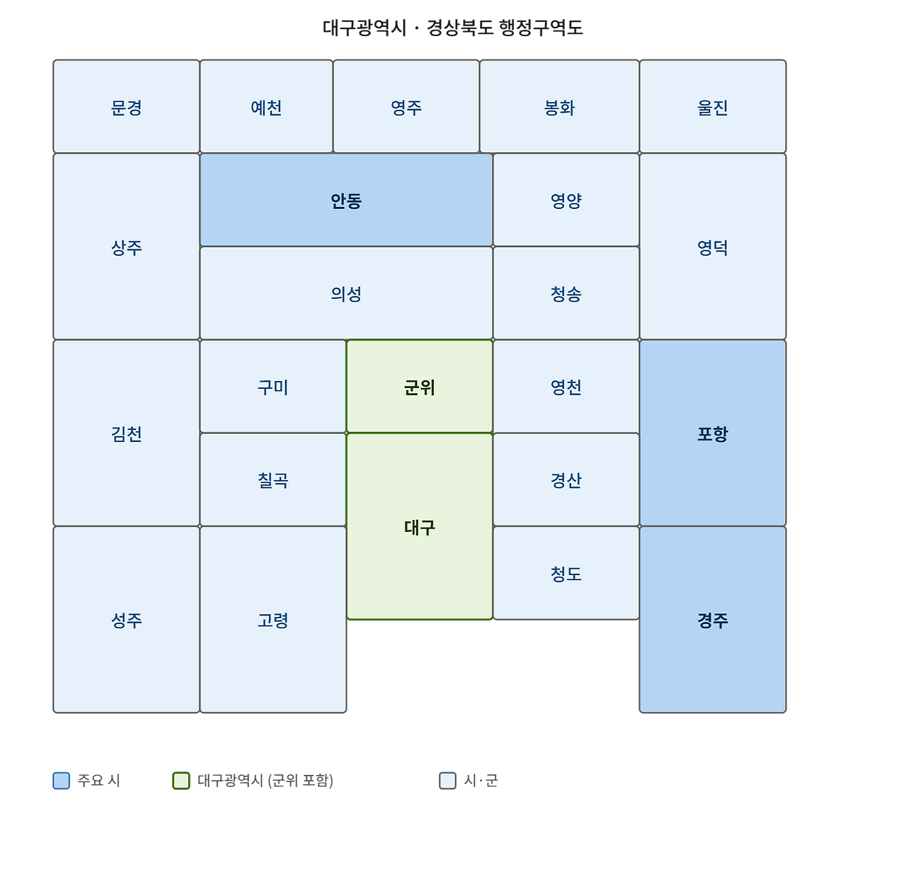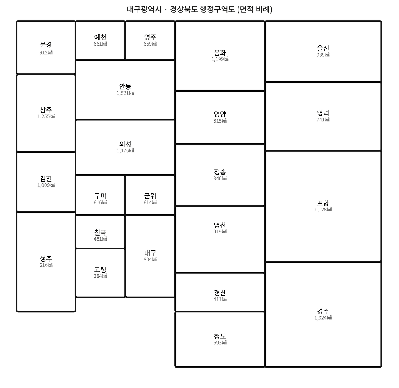 각 사각형의 크기를 실제 면적에 비례하도록 조정했다. 봉화(1,199㎢)와 안동(1,521㎢)은 넓게, 고령(384㎢)과 경산(411㎢)은 좁게. 숫자만 보면 추상적인 면적 차이가 사각형의 크기 차이로 즉각 눈에 들어온다.