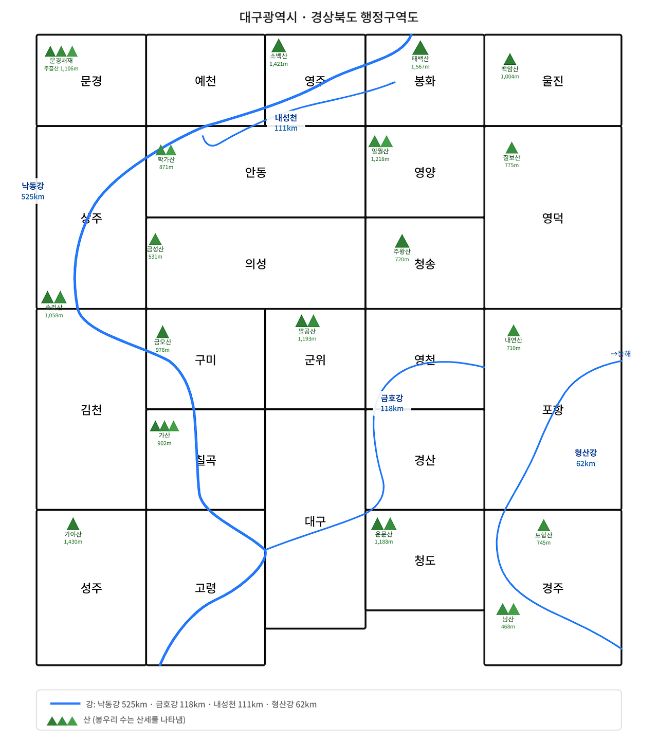 낙동강은 봉화에서 시작해 경북의 중심을 S자로 가로지르며 고령 방향으로 빠져나간다. 지도 위에 그려보니 낙동강이 얼마나 경북의 뼈대를 이루는 강인지 실감 난다. 금호강은 포항 쪽에서 시작해 영천과 경산을 지나 대구에서 낙동강과 합류하고, 형산강은 경주를 가로질러 동해로 흘러든다.