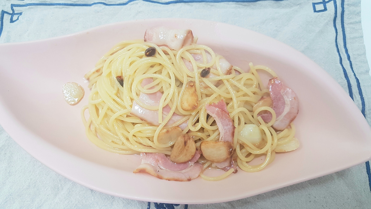 베이컨, 마늘, 올리브유, 페퍼론치노. 재료만 대충 있으면 파스타는 웬만한 한식보다 훨씬 쉽다. 솔직히 마늘, 소금, 올리브유만 있어도 대강 맛은 낼 수 있는 음식이다. 그만큼 가성비 짱인 음식. 영상도 붙여야지 ㅎㅎ