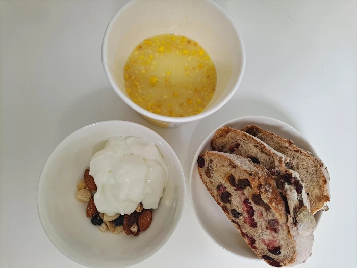 2. 무화과 가득 든 호밀빵과 옥수수 수프, 견과류와 요거트