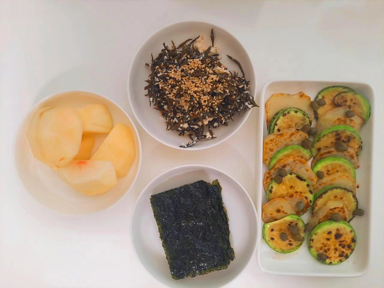 1. 애호박, 감자 구이와 톳나물 두부 무침, 김, 복숭아
