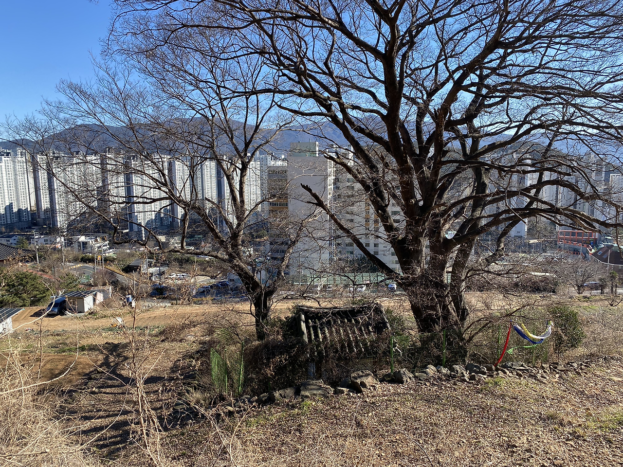 지금은 아파트숲이 익숙한 도시이지만 어느 지역이나 그렇듯 이곳도 아주 오래전부터 사람들이 살아가던 곳이었다. 그때였다면 고목이 마을을 지켜 준다고 믿었을 것이고 그 아래 서낭당을 지어 더 많은 염원을 담았을 것이다. 내가 사는 도시는 외지인의 유입이 많은 도시인 탓에 나는 지금껏 이 고장이 깊이는 얕고 무게는 가벼운 도시라고 생각해왔다. 그런데 아파트숲 이전의 시간을 상징하는 고목과 만나다니 이것은 우연일까? 필연일까?