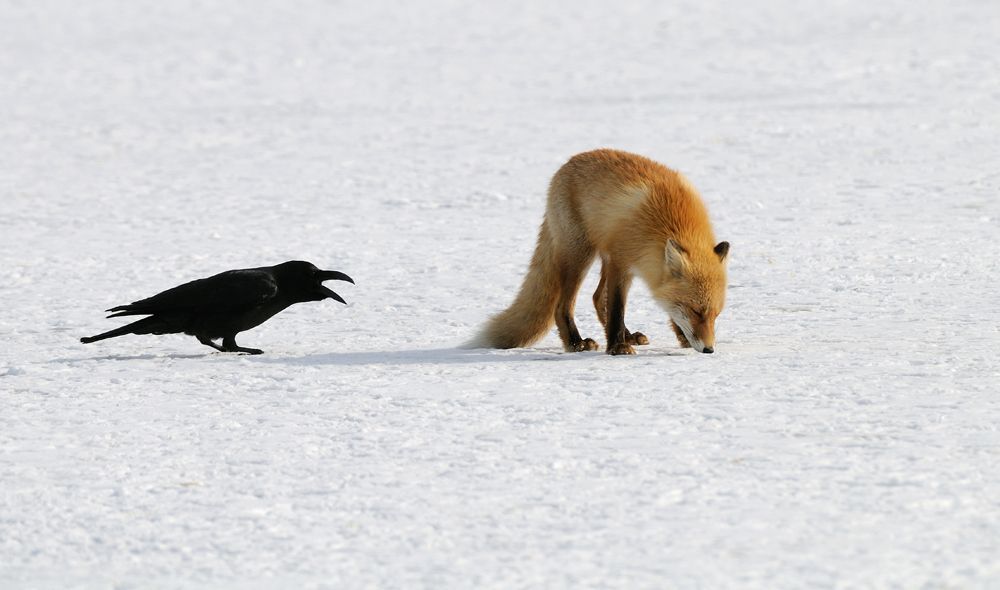 는 제 몸의 반은 됨직한 크기의 갈까마귀 한 마리를 주시하며 한 발을 들고 언제라도 튈 듯한 조심스러운 모습으로 서 있었는데, 마침 갈까마귀가 지원사격을 요청했는지 한 마리가 더 날아와 앉자 여우는 몸을 돌려 재빨리 달아나버렸고, 갈까마귀는 그 뒤를 짧게 쫓아 날다간 내려앉아서, 날개로 가슴을 칠 수 있다면 그렇게 했음 직한 풍채로 까악까악 통쾌하게 울부짖었다.