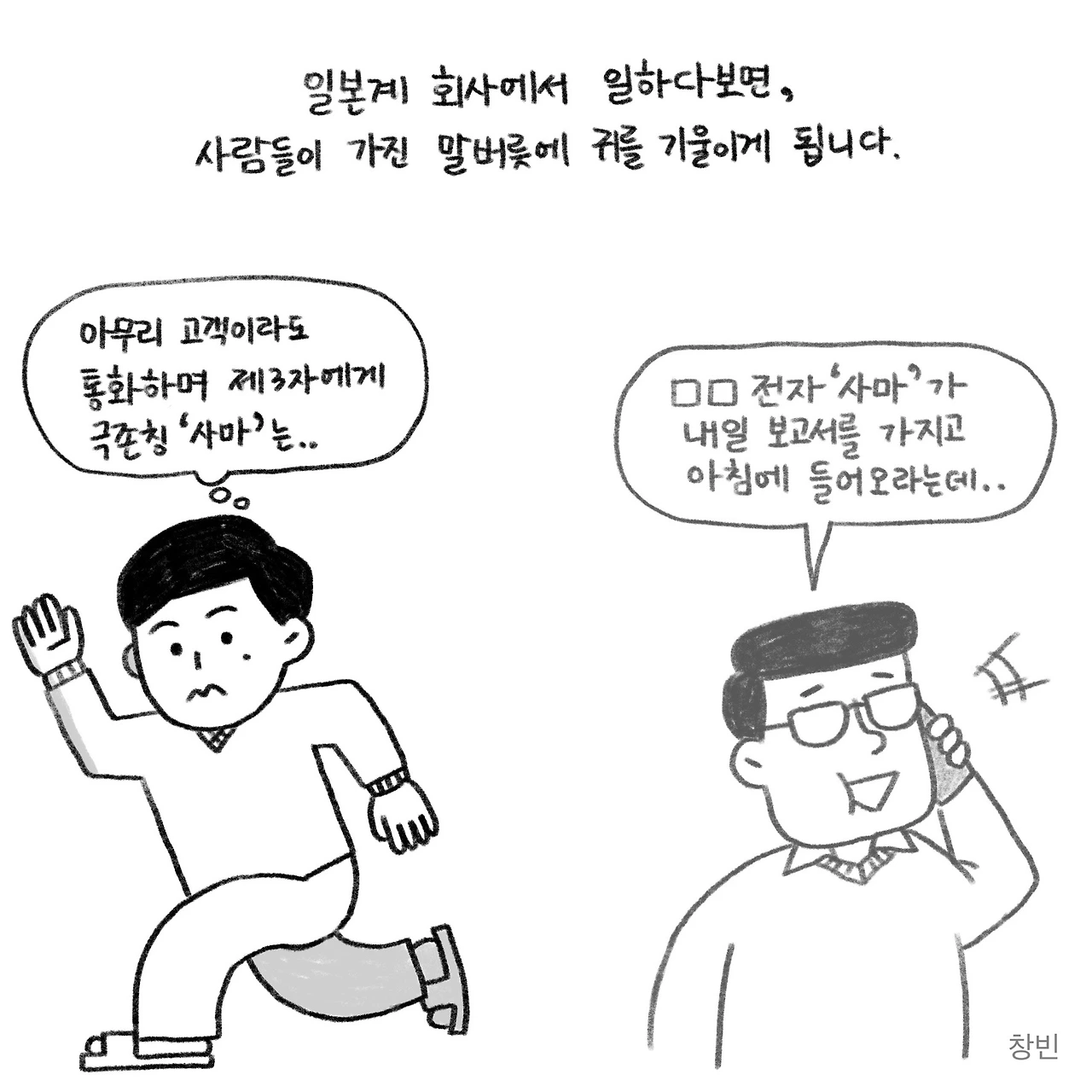 그래서인지 '자칭 일본어 연구자'인 빈짱의 귀에 거슬리는 높임말/낮춤말이 들리고는 합니다. 당사자가 없는 자리에서 고객 회사의 이름을 말할 때마다 꼭 끝에 사마(우리말 '~님'의 +존칭)를 붙여야 하는 걸까요?