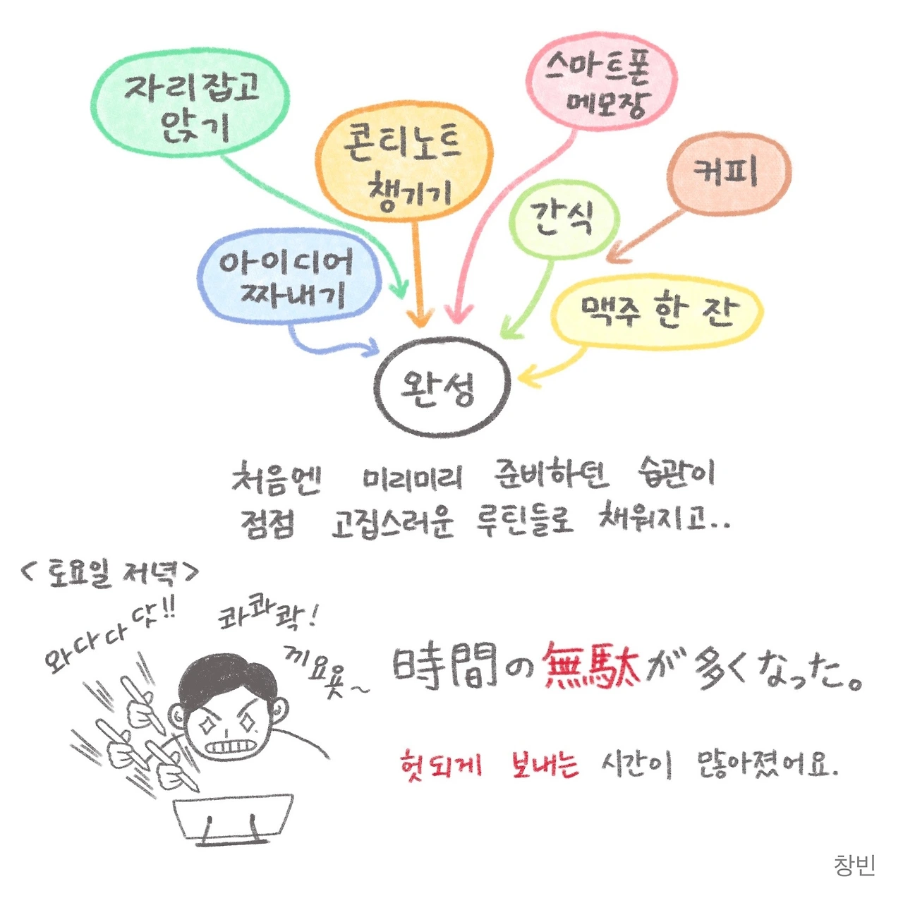 이 말은 오늘을 살고 있는 제게 해주고 싶은 말입니다. 그 순간을 어떻게 보냈는지 내가 느끼는 감정으로 쓸데없음을 정의하지 않기로 했습니다. 그 대신, 언젠가는 비효율적인 '그 행동'을 멈출 것이라는 스스로와의 약속을 지키려고 합니다.