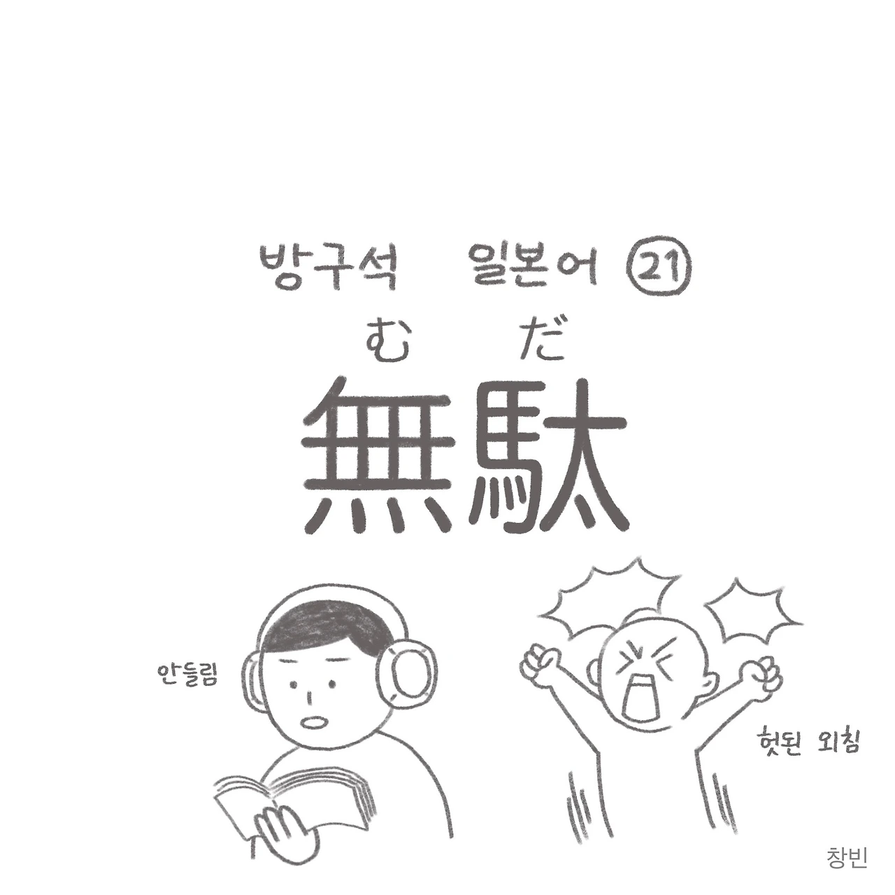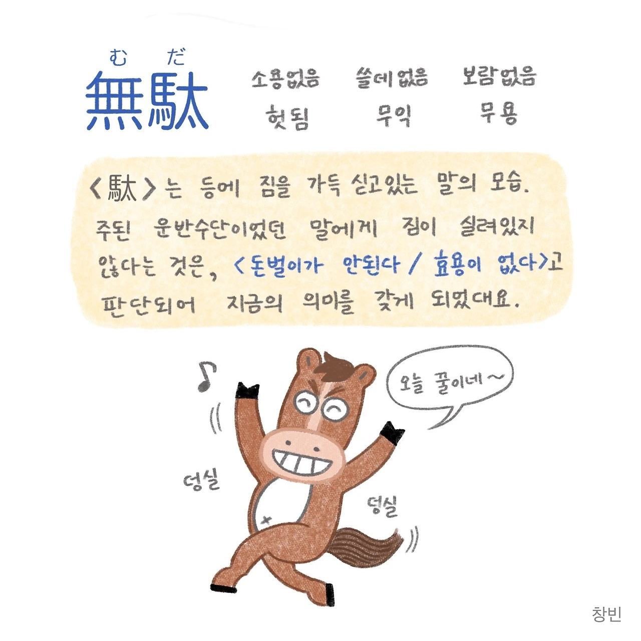 오늘 소개하는 어휘 無駄(むだ, ムダ)는, 본래 짐을 싣고 다니는 말이 일감을 등에 싣지 않은 모양을 보고 만들어졌다고 합니다. 쓸모없다거나, 효율적이지 않다는 뜻을 갖기는 하지만 나쁘다고만 나무라지 않았으면 좋겠어요. 일도 없어봐야 소중함을 알 것이고, 조금 더 쉬면서 스스로를 살필 수 있는 기회가 될지도 모르니까요.