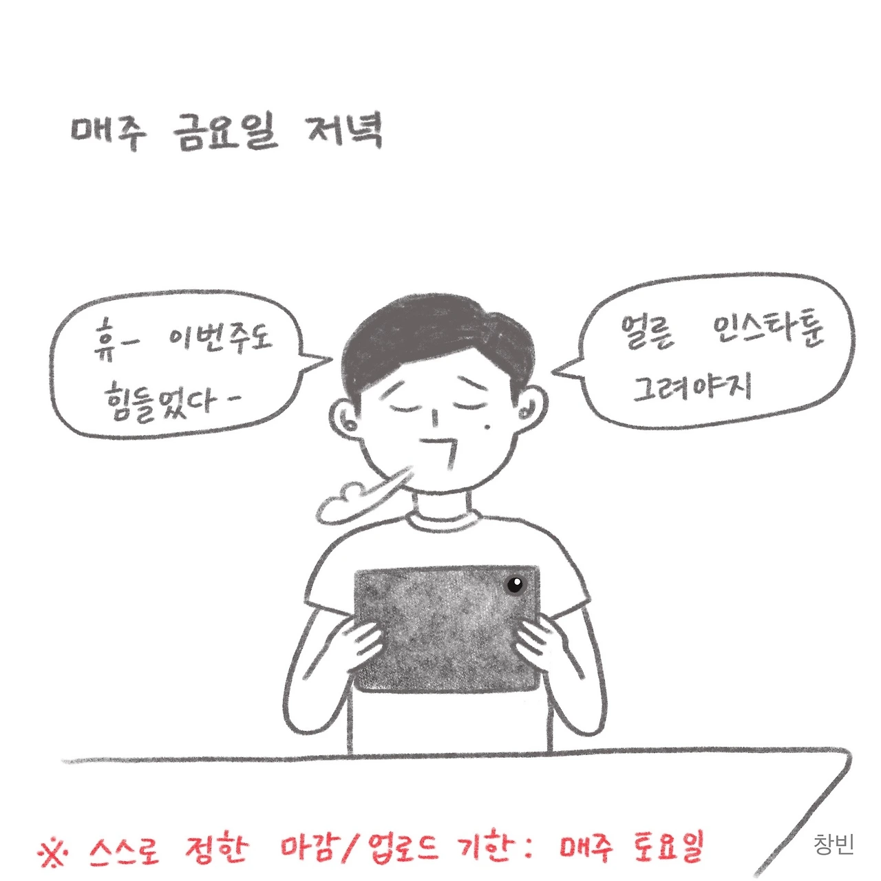 스스로 정한 약속을 잘 지키지 못하는 편입니다. 인스타툰, 블로그나 브런치에 게재하는 글과 그림은 '목표'가 있고 달성하기 위해 일정량의 노력을 반복하다 보니 겨우 궤도에 올라왔습니다. 그래도 매주 만화의 소재를 생각하고 그려내기까지의 과정은 순탄치 않습니다.