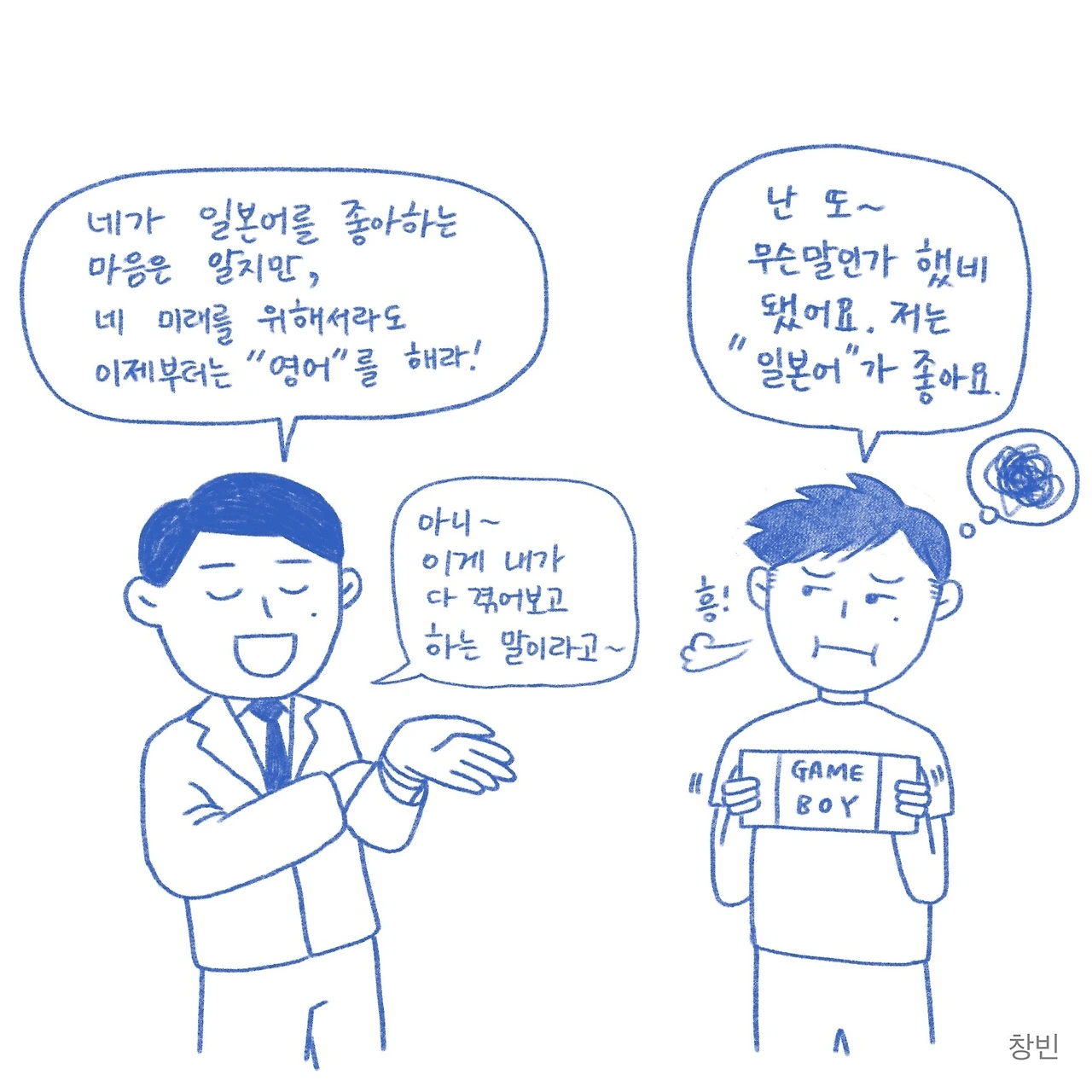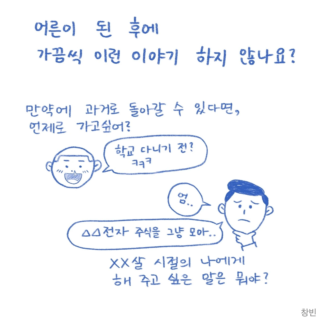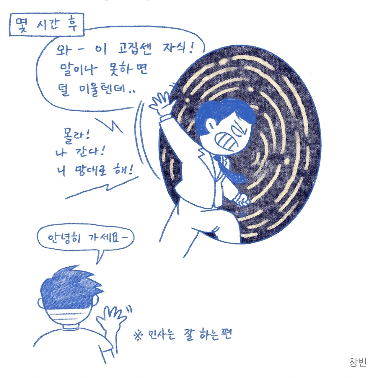 복잡하기도 하고, 이해력이 부족한 저는, 내가 생각하던 '백 투 더 퓨쳐'의 시간 이동은 거짓이라는 전제만 받아들이고 영화에 다시 몰입했지만, 이번 만화를 그리며 다시 생각해보건대 창빈이라는 인격체는 과거나 지금이나 똑같다는 사실을 기반으로 한다면, 아무리 시공간을 넘어선 여행을 하더라도 또 하나의 창빈 역시 저만큼 고집 센 인간일 것이 틀림없기 때문에 상당한 시간을 들여야 하는 수고스러움이 발생한다는 결론에 다다르게 됩니다.