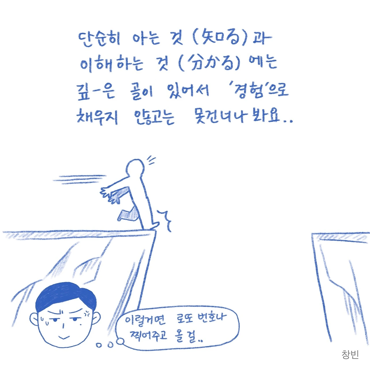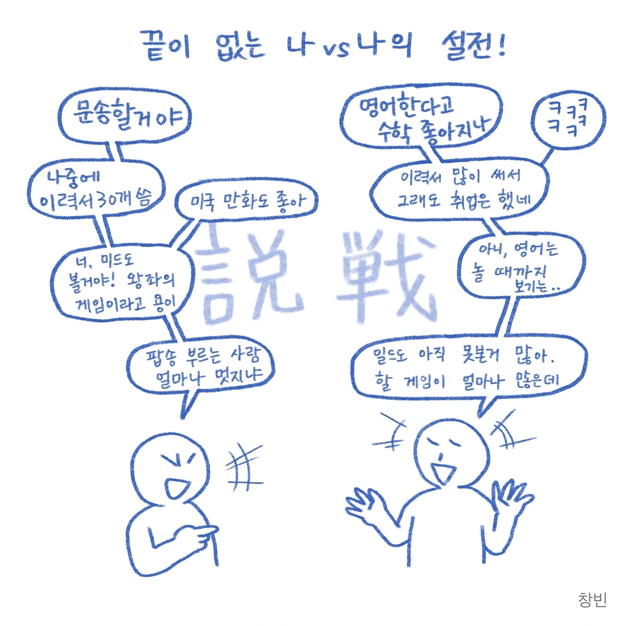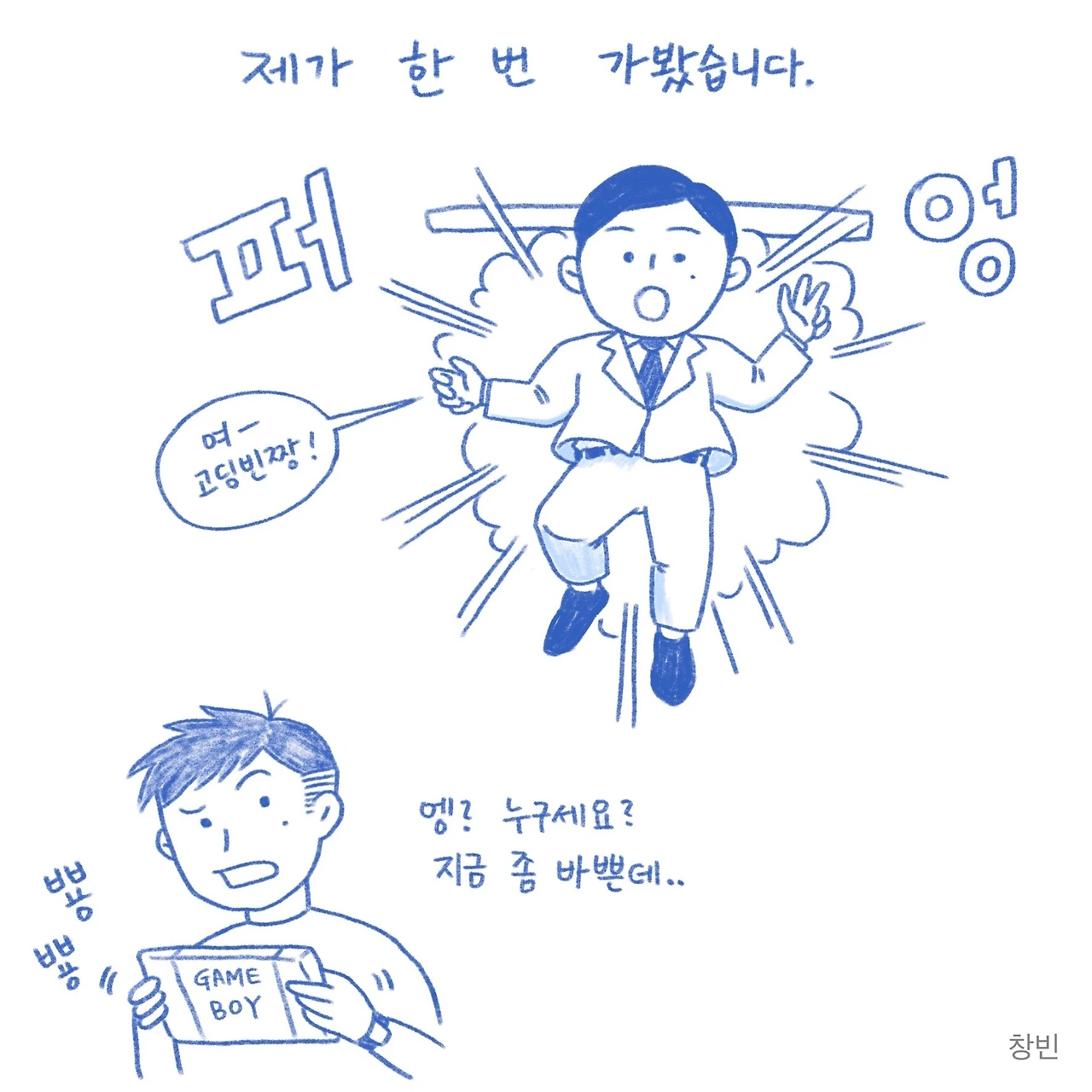 복잡하기도 하고, 이해력이 부족한 저는, 내가 생각하던 '백 투 더 퓨쳐'의 시간 이동은 거짓이라는 전제만 받아들이고 영화에 다시 몰입했지만, 이번 만화를 그리며 다시 생각해보건대 창빈이라는 인격체는 과거나 지금이나 똑같다는 사실을 기반으로 한다면, 아무리 시공간을 넘어선 여행을 하더라도 또 하나의 창빈 역시 저만큼 고집 센 인간일 것이 틀림없기 때문에 상당한 시간을 들여야 하는 수고스러움이 발생한다는 결론에 다다르게 됩니다.