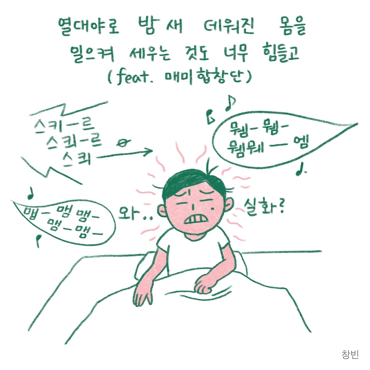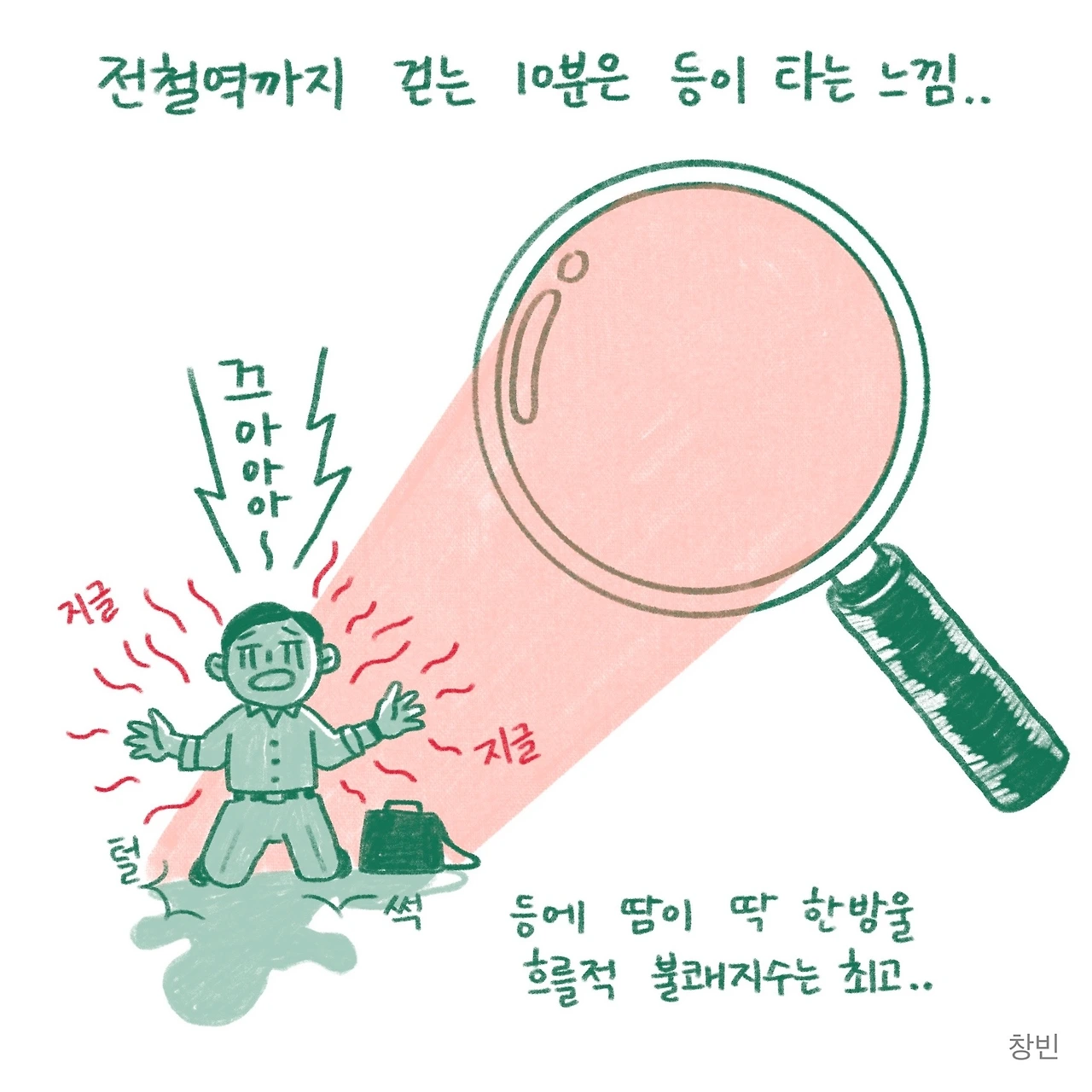 한동안 '일단 잠은 들어야 하니까'라는 근사한 핑계로, 갓 꺼낸 캔에 송골송골 맺힌 물방울을 느끼며 맥주를 들이켜고 누워야 하는 밤이 이어지겠지. 아침 출근길은 어떻게 걸어도 덥겠지만, 만원 지하철에서 등 뒤 척추 방향을 따라 또르르 땀방울이 흐르지 않을 정보면 좋겠다고 생각한다. 아니 땀은 흘러도 좋다. 정체모를 타인과의 접촉으로 그의 몸이 고된 출근길에 얼마나 데워졌는지만 모르면 좋겠다.