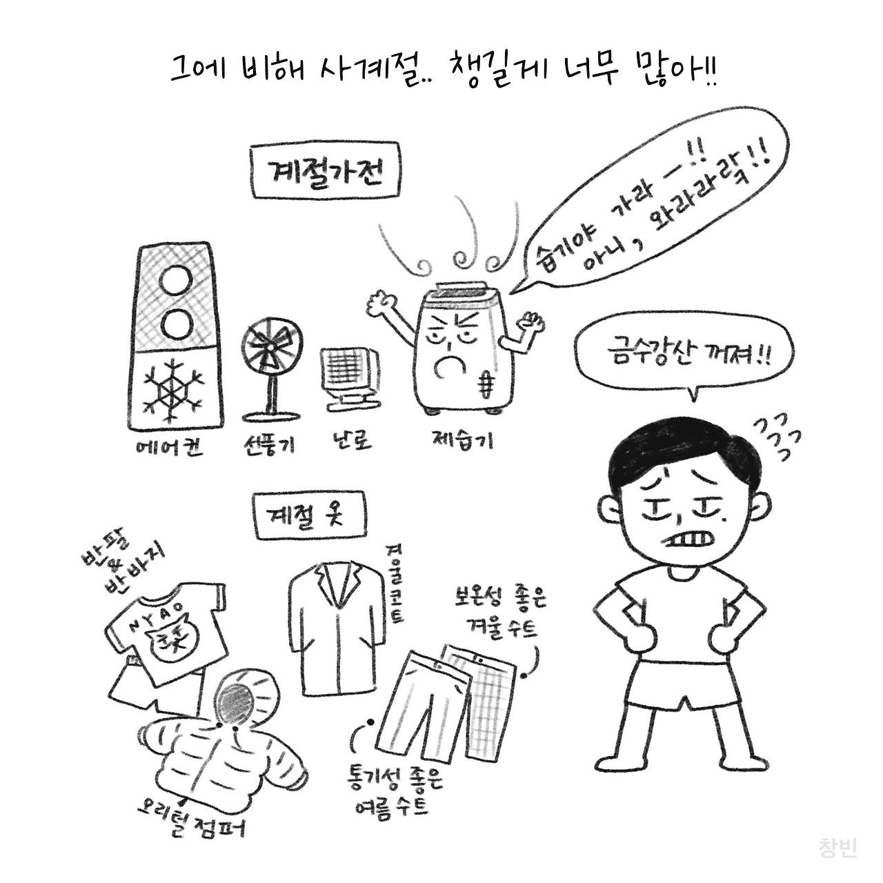 계절이 바뀌면 붙박이장 깊은 곳에서 새 계절용 옷상자를 꺼내고, '우기', '장마'라는 축축한 어감의 단어에 빠져들지 않기 위해 제습기를 꺼내거나 에어컨은 문제없이 잘 동작하는지 테스트를 해 봅니다. 처음 들어간 신혼집에서는 매년 여름마다 에어컨이 말썽을 일으키는 바람에 밤잠을 설치며 스트레스에 시달렸던 기억도 떠오르네요.