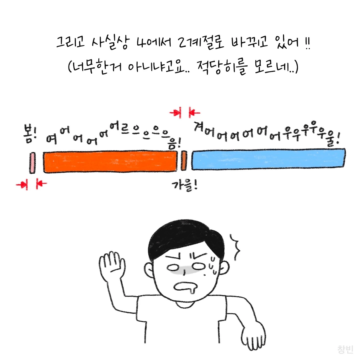 직장인이자 만화가(자칭), 브런치에서는 '작가'로 활동하듯, 다양한 정체성을 가지고 내 삶을 더 다양하게 꾸려가고자 하는 욕심은 춥고 더운 날씨를 골고루 겪어가며 변화를 체험했기 때문일지도 몰라요. 새삼 환경보다는 '내 마음'을 들여다보는 계기가 되기도 했습니다. 그래서 나는 어떻게 살고 싶은가? 계절 핑계를 대며 투덜대고 있었지만, 제가 진짜 원하는 건 '한결같음'이었고, '변화에 흔들리지 않는 사람'이었습니다.