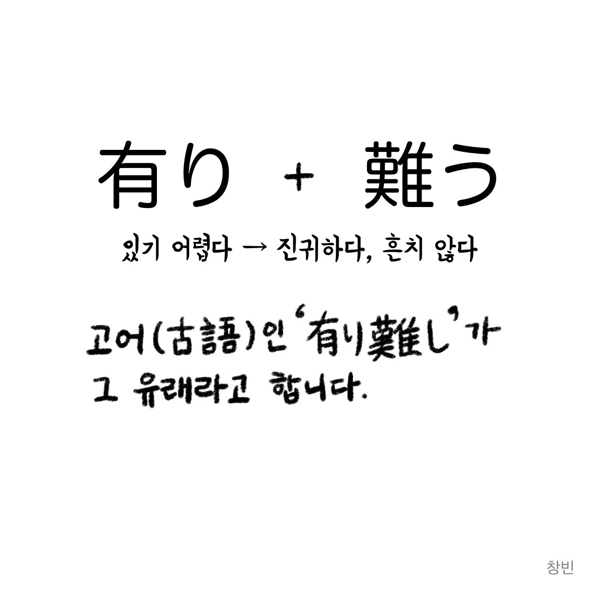 '있을 유'에 '어려울 난'자를 붙여 만들어진 단어라니. 궁금함을 참지 못하고 스마트폰을 열어 일문 사전에서 검색해보니 한자가 섞인 이 표현이 사전에도 등록되어 있습니다.(당연하게도요.) 적잖이 놀랐고, 구글에서 有難う 語源(아리가토우 어원)을 검색해보았습니다.
