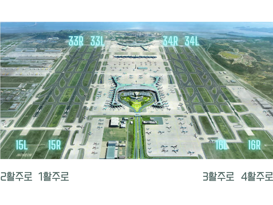 인천공항에는 활주로가 네 개 있다. 실제로 사용하고 있는 건 보수공사를 위해 잠시 닫은 제2활주로(33R-15L)를 제외한 세 개 활주로다. 일반적으로 활주로는 바람에 따라 두 개의 반대 방향으로 사용이 가능하다. 인천공항의 제3,4 활주로는 34 또는 16이라는 방향을 사용하며, 정풍(head wind)을 맞고 이착륙해야 하는 항공기 특성상 풍향과 풍속이 활주로 방향의 가장 중요한 결정 요인이 된다.