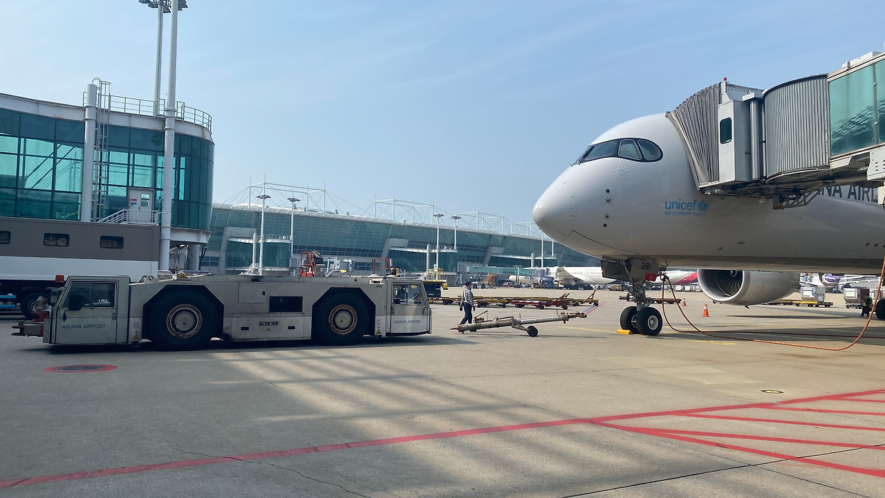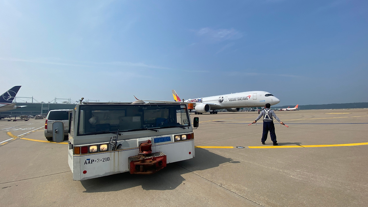 이륙을 위해 활주로를 달려가는 비행기 꽁무니를 그네 밀듯이 밀어주었다고 했던 우리 엄마처럼, 드디어 오늘 비행기를 밀어주는 차량에 타 볼 수 있는 기회가 주어졌다. 일반적으로는 아시아나항공의 조업을 담당하는 '아시아나에어포트'라는 지상조업사의 협조로 출발편의 후방견인을 돕는 견인차량에 탑승해 보았다.