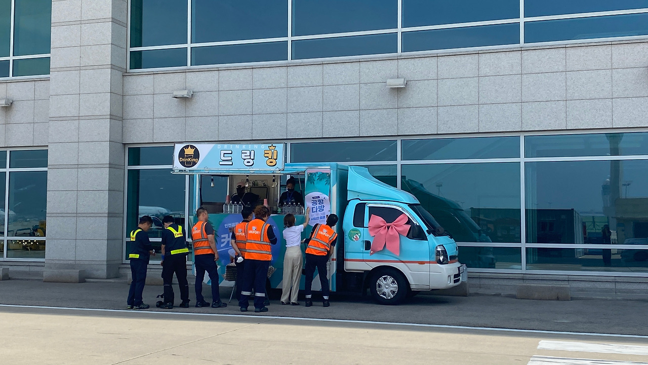 관제탑 앞에 온 커피조공차와 커피를 받아가는 사람들.