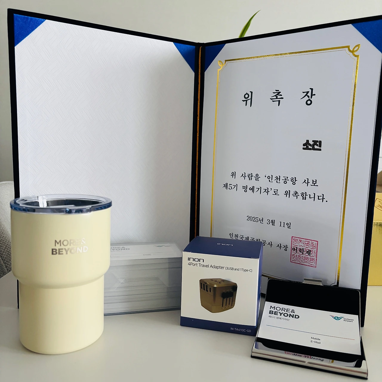 오늘은 인천공항 명예기자단 5기에 선발되어 발대식에 다녀왔습니다. 인천공항의 잡지인 <MORE&BEYOND>에 명예기자단의 글이 실리게 될 예정입니다. 격월로 발행되는 <MORE&BEYOND>는 공항과 항공, 여행을 좋아하는 사람들이 재미있게 읽어볼 수 있는 잡지예요. 인터넷 검색창에 ‘인천공항 사보’를 검색하면 곧바로 웹진을 확인할 수 있습니다. 대학생 때 한국공항공사의 기자단 활동을 해 본 경험이 있는데 드디어 인천공항에서도 기자로 활동해 보네요! 학생 때보다는 실감 나는, 에세이 책보다는 편하고 재미있는 글을 써 내보려고 합니다. 특히 제 에세이에는 크게 적합하지 않았던 류의 주제들을 꺼내 보일 수 있다면 가장 좋겠지요?