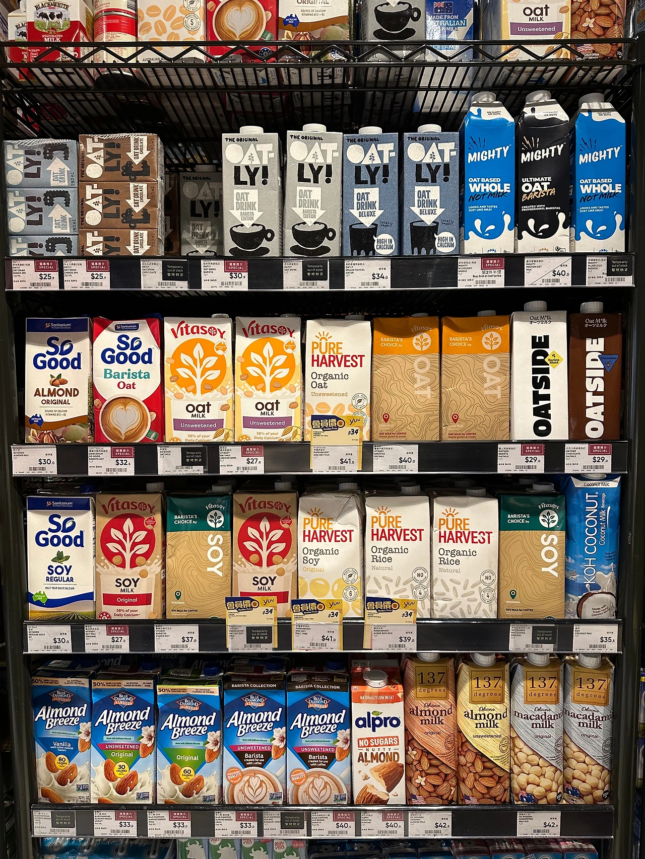 호텔 앞 슈퍼마켓의 대체 우유 섹션.