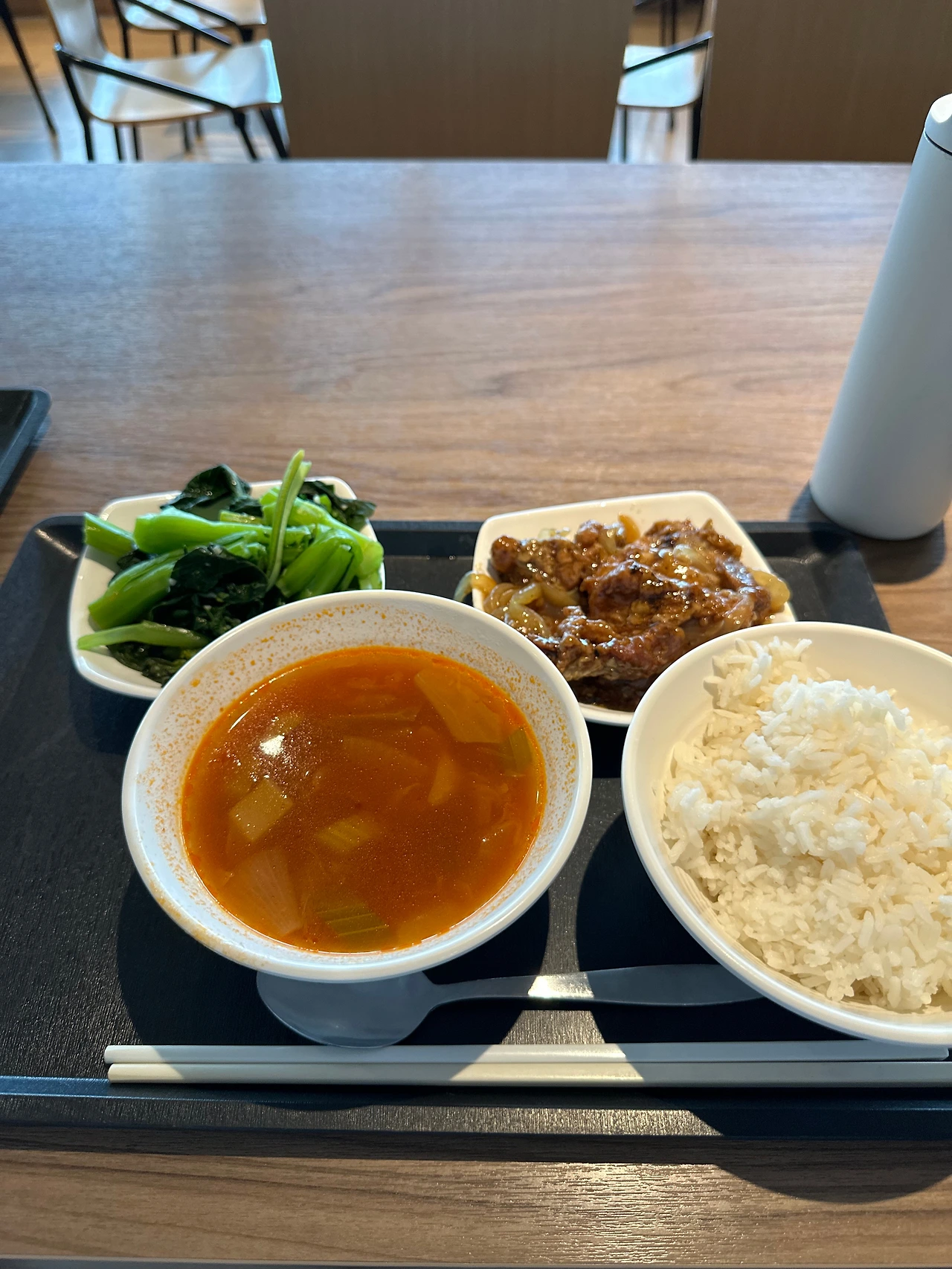 드디어 회사 식당에서 회사 음식을 먹게 되었다.