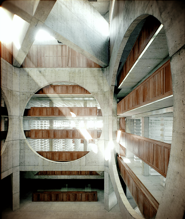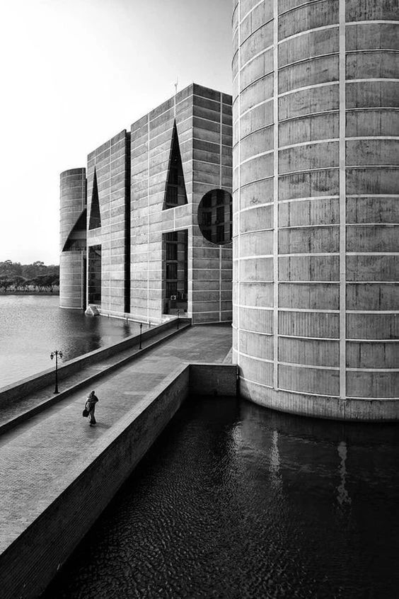 그 많은 책들 중에서 건축가 루이스 칸의 방글라데시 국회 의사당 건물을 처음 사진으로 봤을 때의 충격은 지금도 생생히 기억날 정도로 강렬했다. 내가 이제껏 봐왔던 어떤 건축 양식과도 다른 엄청난 스케일의 기하학 적인 구조들과 햇빛, 그림자들의 대비를 보고 있자니 하나의 거대하고 신성한 조각상을 보는 것 같았다. 원, 삼각형, 사각형 등의 기하학적인 모양의 빈 공간들과 구조들은 어릴 때 가지고 놀 던 장난감들 같아서 왠지 모를 익숙함을 느끼기도 했다. 마치 중력을 가지고 노는 것 같은 거대한 콘크리트 구조들을 보고 있자니 조금은 무섭기도 했다. 공포의 무서움이 아니라 익숙하지만 낯선 것에 대한 경이로움과 이 것이 어떻게 지어졌는지 도대체 감이 잡히지 않는 나의 조바심, 그리고 '사람이 이걸 만들었다고?'라는 많은 감정들의 복합체였다. 마치 정말로 아름다운 작품 앞에 서면, 이성적인 설명보다는 감정적으로 압도되어서 시간 가는 줄 모르는 것처럼 한동안 계속 책장을 번갈아 가면서 봤다. (만약 내가 실제로 그 공간에 있었더라면 감동해서 울었을지도 모른다.) 도저히 책 속의 사진들 만으로는 실내 구조들, 스케일, 동선이 잘 이해가 되지 않아서 며칠 동안 평면도와 건물 단면도들만 뚫어져라 쳐다봤던 기억이 난다. 마치 다른 나라의 언어들을 처음 배울 때처럼 계속 쳐다보면서, 읽고, 이해하려고 했다. 건축과 구조에 관해서 이성적으로만 접근하려고 했던 나에게 루이스 칸의 건축물은 중력과 주변 환경에 대한 인간의 대응 만이 아닌, 언어나 예술처럼 인간 본연의 표현 욕구의 일부분이기에 참으로 감정적이고 섬세하다는 것을 깨닫게 해 주었다. 루이스 칸은 이 건물을 디자인할 때, 특히 건물 구조만으로도 에너지 효율적으로 외부에서 들어오는 빛을 잘 컨트롤할 뿐만 아니라, 그 빛의 방향성, 그림자와의 대비와 스케일로 웅장하고, 거의 종교적일 정도의 신성한 건물의 분위기를 냈다. (그의 다른 프로젝트 중 1972년 작인 킴벨 미술관도 그 예시 중 하나이다. 관심 있는 분들은 찾아보시길.)