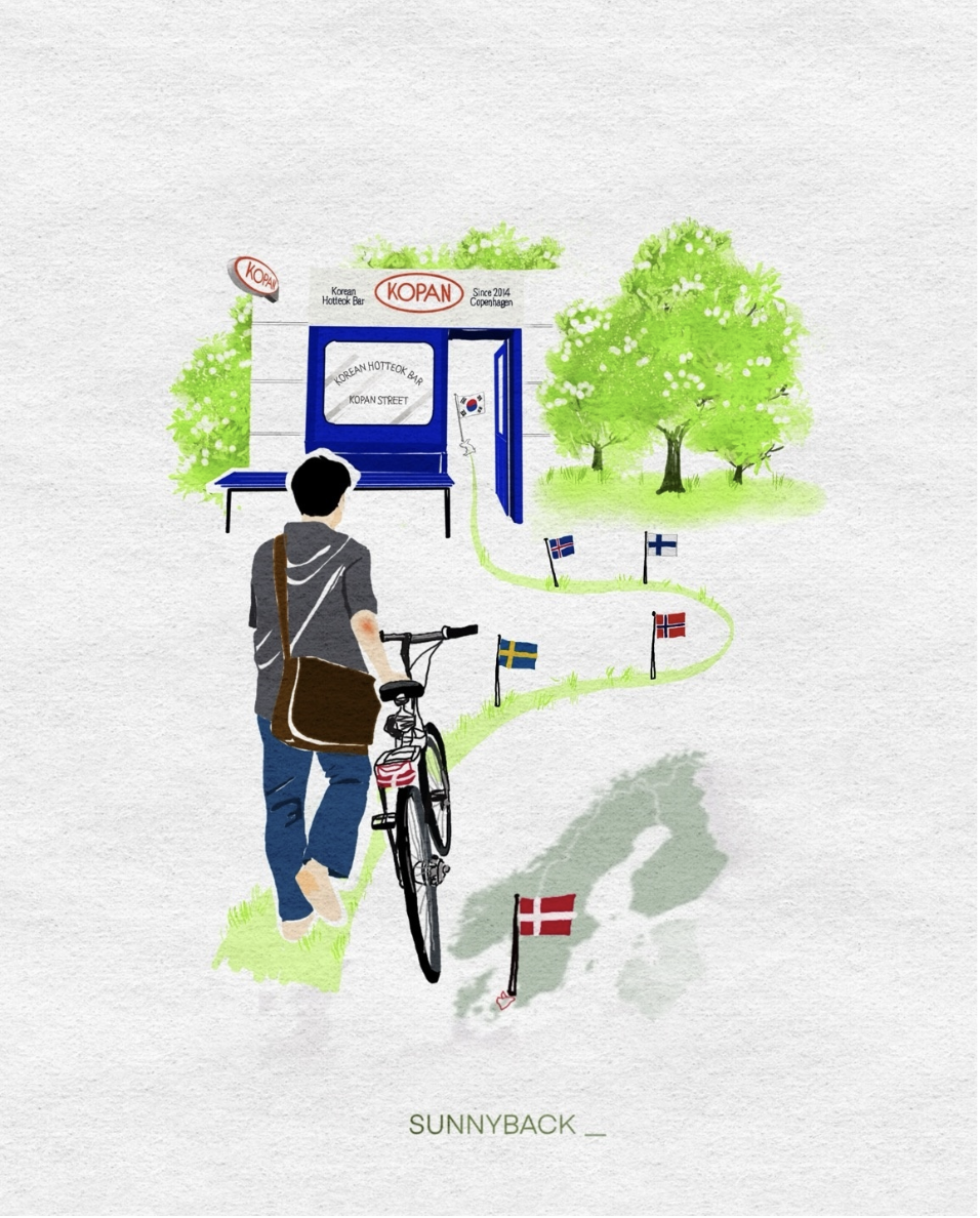 와우! 주차 딱지 걱정으로 멍했던 머리가 번쩍 뜨였습니다. 코리안 팬케이크, 코펜하겐. 이름 안에 정체성과 지역이 모두 담긴 완벽한 작명이었습니다. 제가 경외심에 찬 표정을 짓자 그분이 마지막 질문을 던지셨습니다.