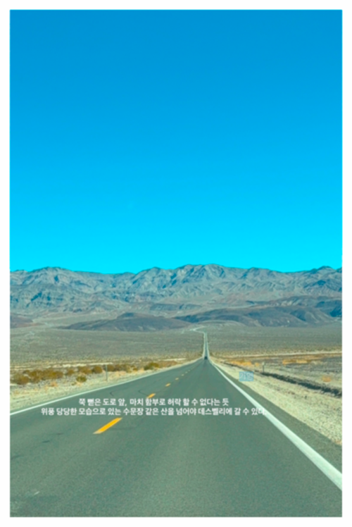 데스밸리는 분지라서 산으로 둘러 싸여 있다. 이 산들은 이 위험한 곳에 아무나 허락할 수 없다는 듯 수문장처럼 서 있고 우리는 이 산을 넘어야 데스밸리에 도달할 수 있다.