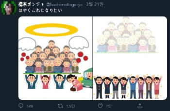 지난 21일 트위터에는 일본 국적인 것으로 추정되는 한 누리꾼이 두 장의 일러스트를 게시했다. 이 일러스트에는 상대적으로 나이가 어린 사람들이 수십 명의 노인들을 떠받치며 힘겨워하다 노인들이 사라지자 두 손을 치켜들며 기뻐하는 모습이 담겼다.