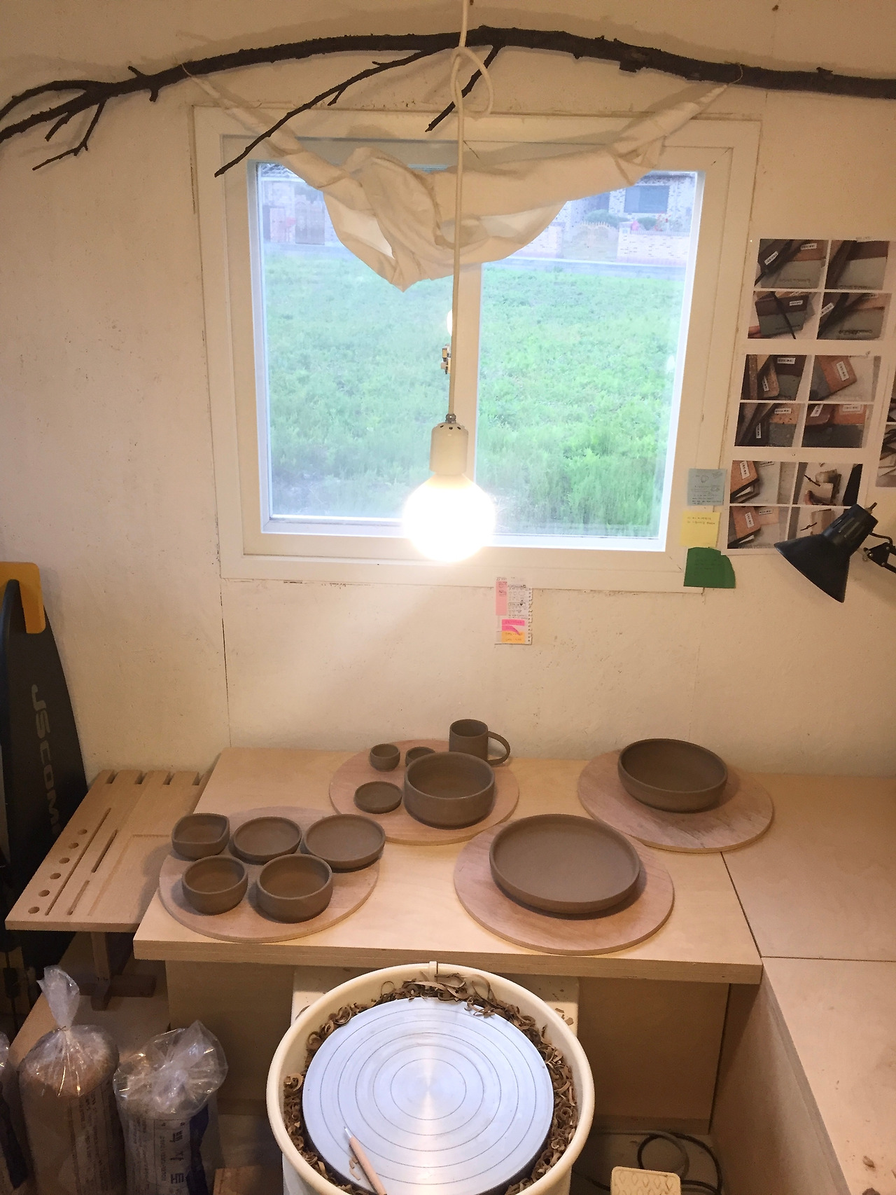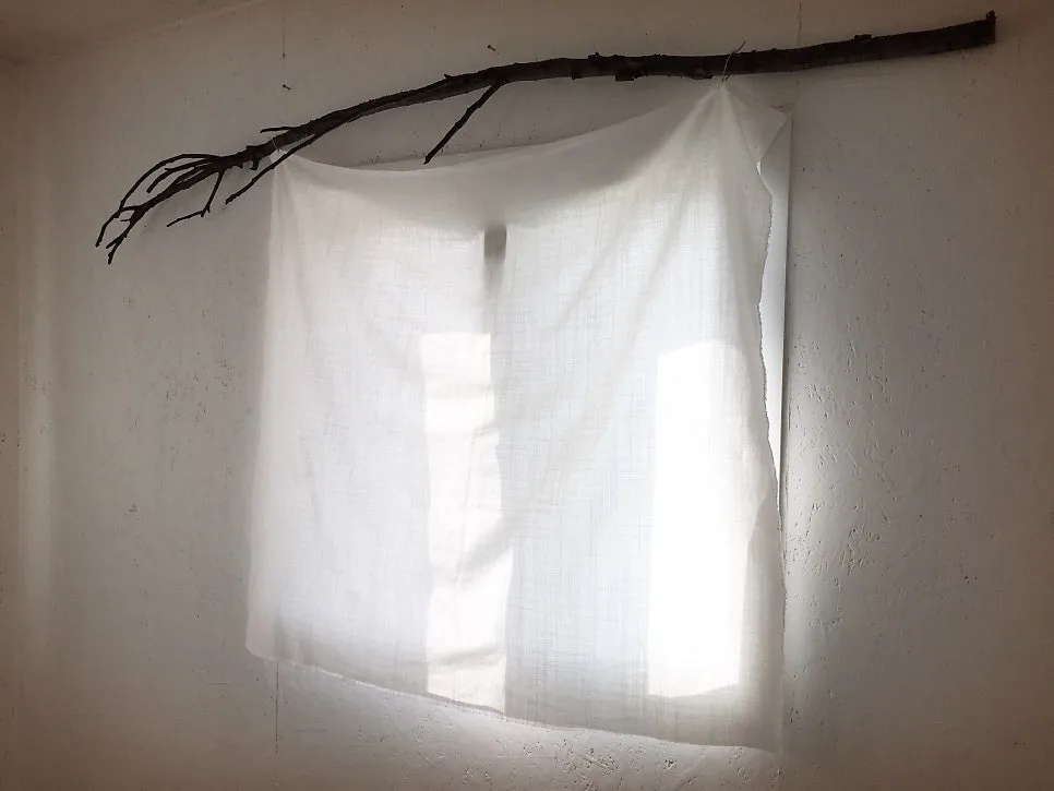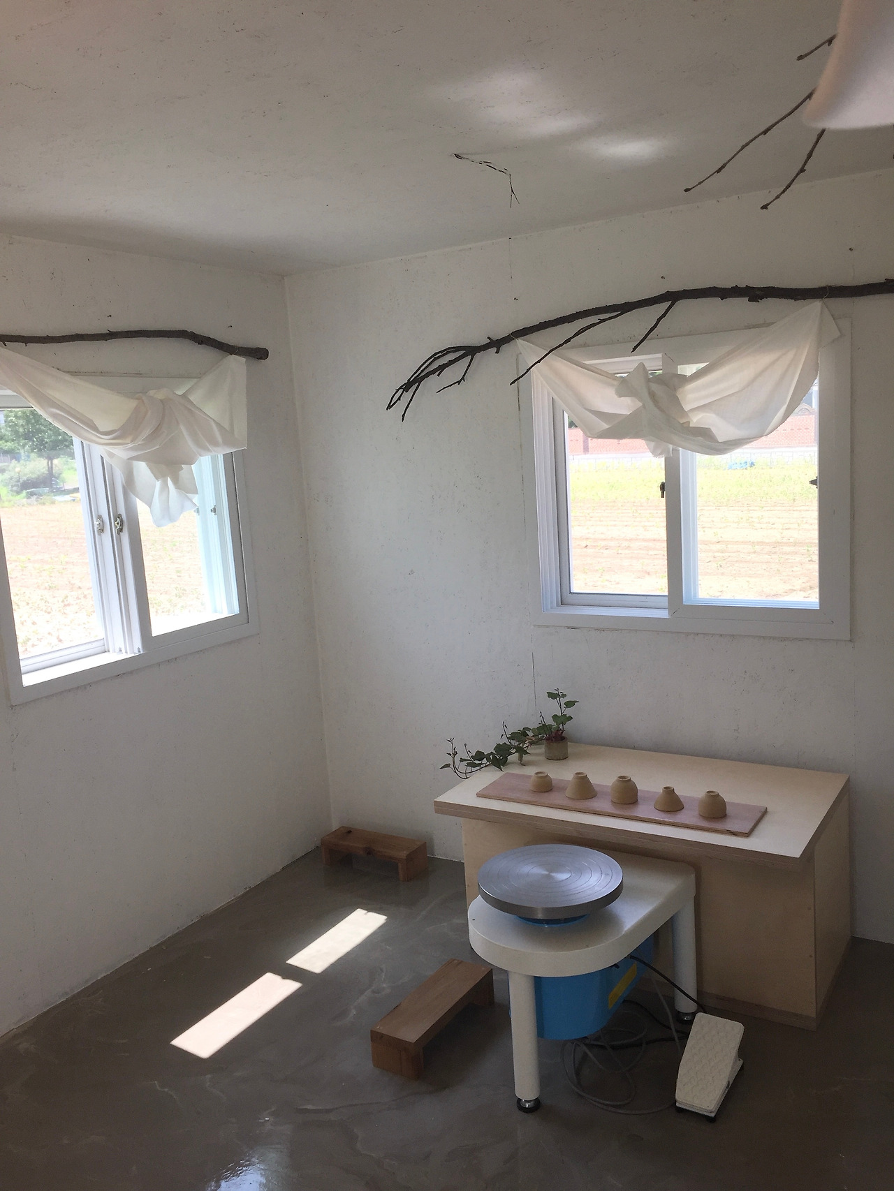 나만의 느낌을 담아 보겠다며 나뭇가지를 주워다가 커튼 봉처럼 썼다. 노끈을 묶어 정사각으로 자른 리넨을 걸었다. 해가 안쪽까지 깊게 들어올 때는 천을 내렸다가 해 질녘에는 나무에 말아 올려 노을을 즐기며 작업했다.