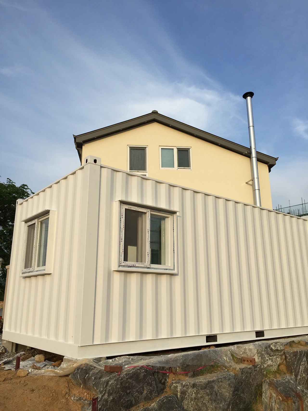 컨테이너가 오는 날. 2톤에 가까울 정도로 무겁기 때문에 운반은 사람이 아닌 카고로 했다. 그 커다랗고 무거운 컨테이너가 인형 뽑기 하듯 대롱대롱 매달려 마당에 올라오는데 갑자기 ‘쿵!’ 하고 떨어질까 봐 얼마나 조마조마하던지... 다행히 기사님은 노련한 분이었다. 줄로 표시해 둔 자리에 나비처럼 사뿐히 내려주셨다.