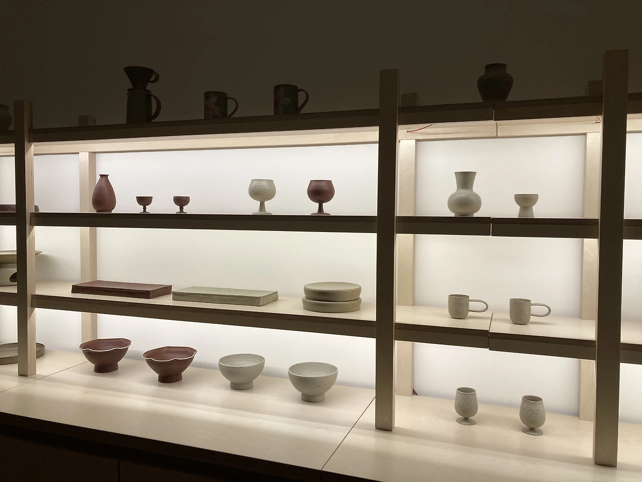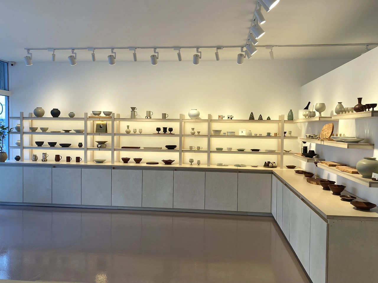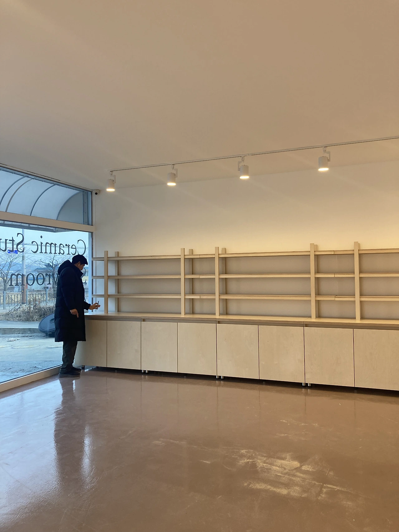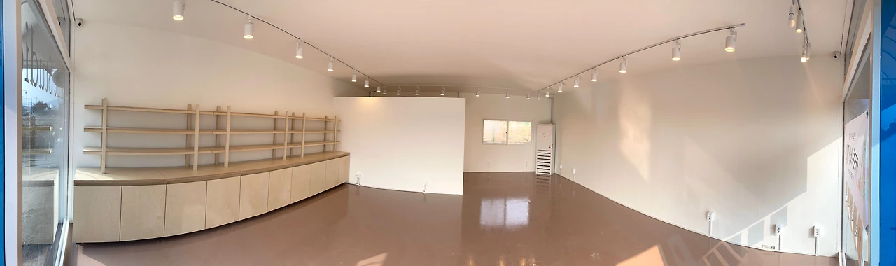 벽과 천정에는 석고보드를 대고, 보드 사이에 퍼티를 발랐다. 이음새엔 메쉬망을 붙이고, 퍼티를 한 번 더 발라 틈을 충분히 메웠다. 바른 게 마르면 표면을 매끈하게 갈아낸 후에 전시할 도자기가 돋보일 수 있게 도화지처럼 하얀 페인트를 칠했다. 벽에 발랐던 퍼티를 갈아내는데 새하얀 가루가 흩날렸다. 그와 같이 있으니 내리는 눈을 보는 기분이었다. 그 조차도 예뻐 보였다. 다음은 바닥 차례. 자동 수평 모르타르를 치고, 프라이머를 발랐다. 패인 부분에 퍼티를 발라 채운 후 에폭시를 칠했다.