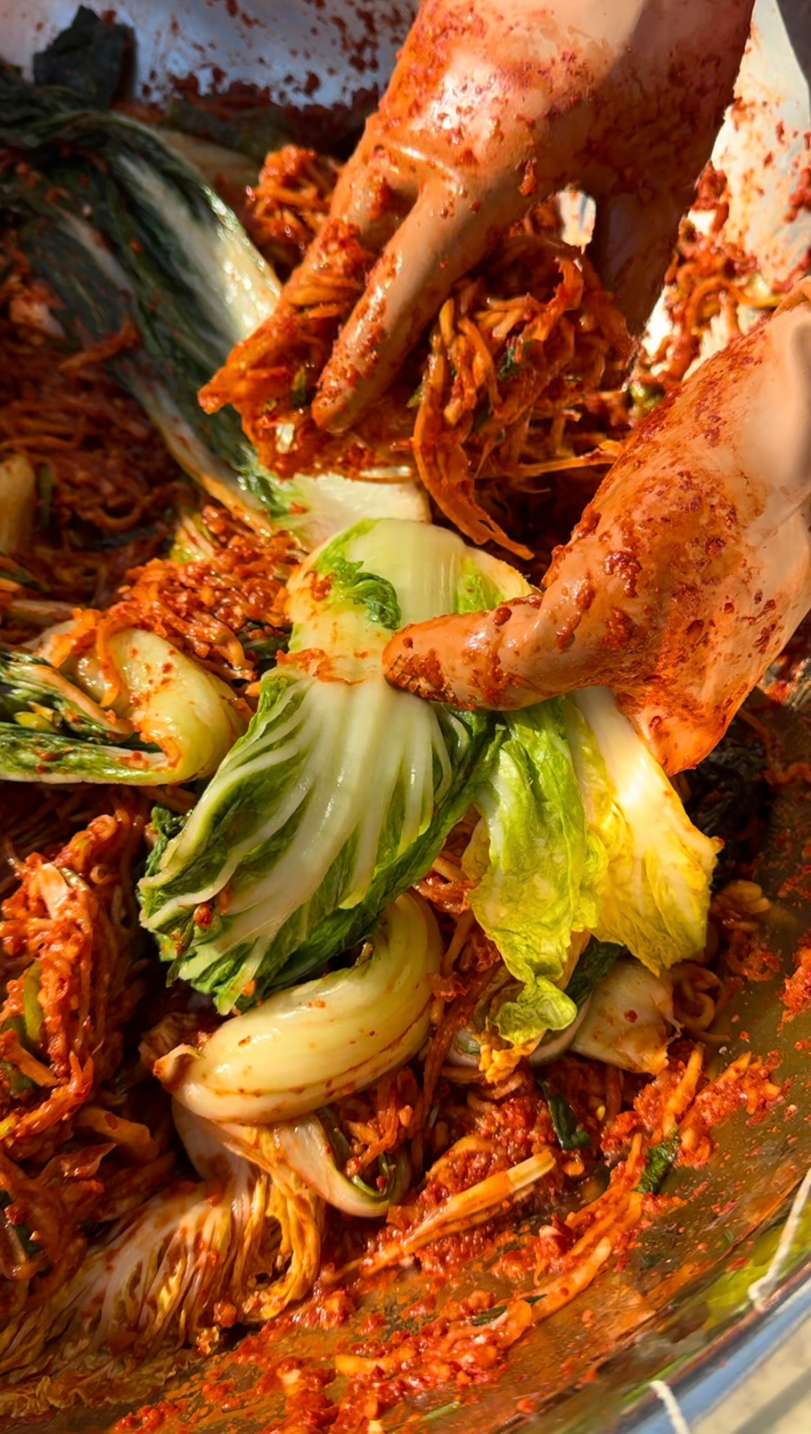 김치속을 쥐고 배춧잎을 한 장 한 장 펼치며 꼼꼼하게 발라준다.