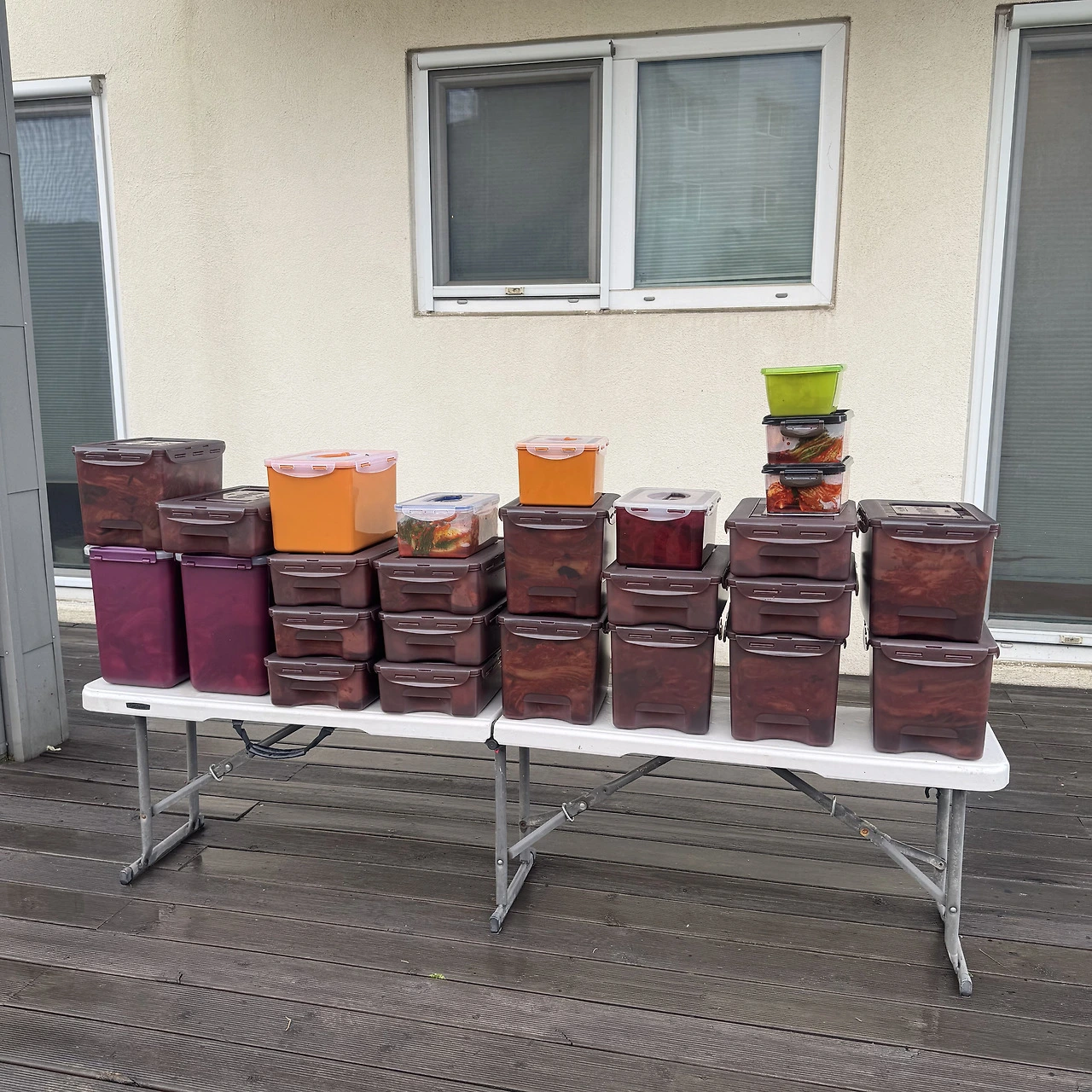 속을 많이 넣으면 김치가 텁텁하다. 쥐고 있는 양념을 잎마다 적당히 배분하는 게 중요하다. 작년, 재작년 김장 에피소드를 얘기하며 일하다 보니 탑처럼 쌓여있던 배추가 어느새 몇 개 남지 않았다. 곧 끝난단 생각에 벌써부터 엉덩이가 들썩인다. 통에 김치를 차곡차곡 담고 초록색 겉잎을 제일 위층에 이불처럼 덮은 후에 꾹 누른다. 김치가 쌓일수록 뿌듯함도 쌓인다. 김치통에 받을 분들 이름을 적고 1박 2일 김장 대단원의 막을 내린다.