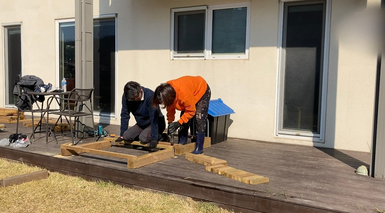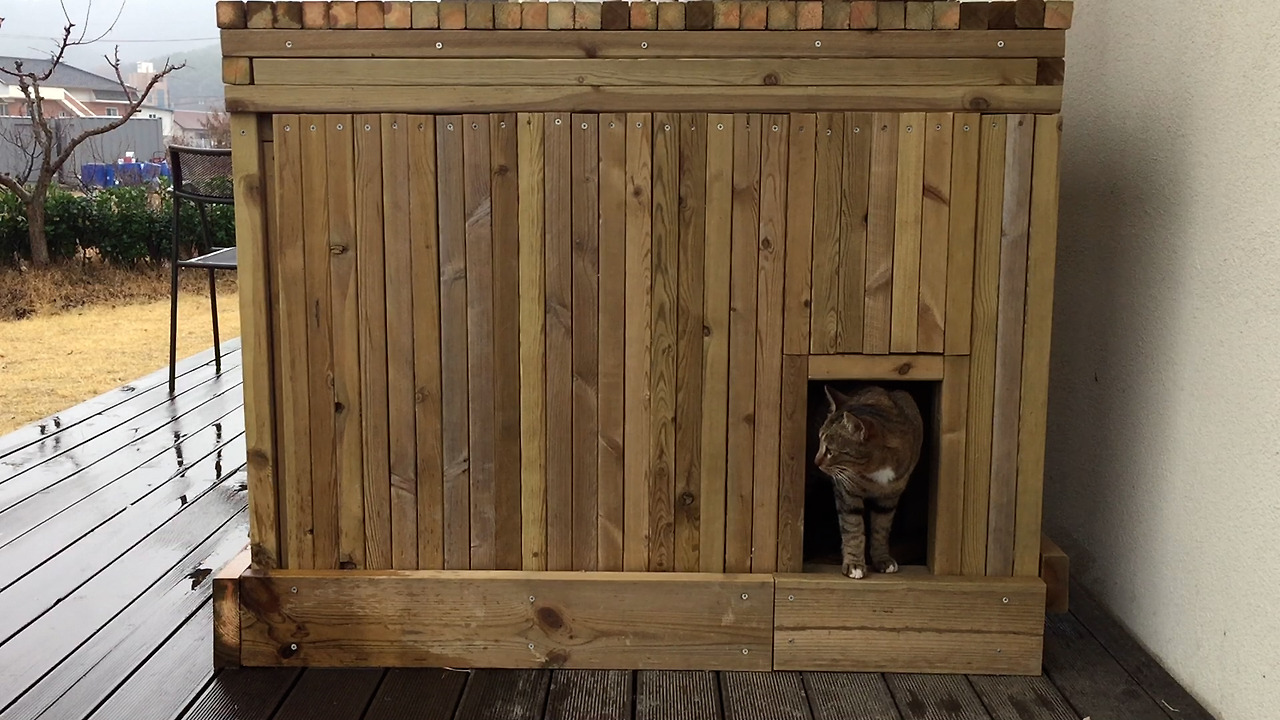 찬바람이 불기 시작하면서 바깥 생명들의 안녕이 걱정되기 시작했다. 마침 울타리를 만들고 남은 나무 자재가 있어 남편과 함께 고양이들의 집을 만들어 주기로 했다. 냥이들을 위한 목조주택이다. 건설의 제일 중요한 포인트는 첫째도 보온, 둘째도 보온. 마침 집 짓는 공사 현장에서 얻어온 단열재가 있었다. 아낌없이 넣어서 발바닥에 땀날 정도로 따듯한 집을 만들어줘야지!