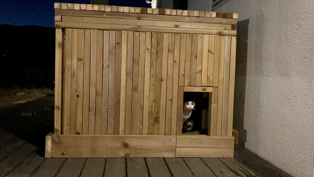 허리 펼 틈이 없었다. 그래도 콧노래가 나왔다. 고양이들이 겨우내 들어가 따듯하게 지낼 생각을 하니까. '드르륵!' '드르륵!' 드릴도 경쾌하게 움직였다. 판 안쪽으로 두꺼운 비닐을 깔고 단열재를 두툼하게 넣었다. 옆 마을에서 왔나? 처음 본 고양이 가족이 먼발치에서 지켜보고 있었다. ‘얼마나 잘하는지 보겠다옹~’